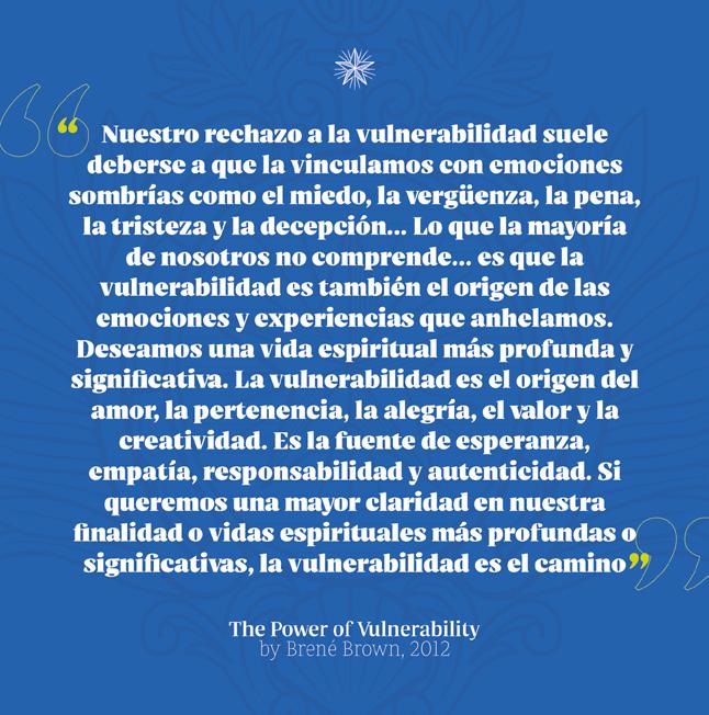Brene Brown nos apremia a aceptar nuestra vulnerabilidad, ya que “es la cuna del amor, de la pertenencia, la alegría, el valor y la creatividad”. San Pablo compartía esta misma idea: “Por eso, me complazco en mis debilidades, en los oprobios, en las privaciones, en las persecuciones y en las angustias soportadas por amor de Cristo; porque cuando soy débil, entonces soy fuerte.” (2 Cor 12,10).