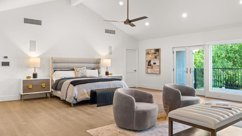 The primary suite, located upstairs, is a true sanctuary. With its vaulted ceilings, an oversized walk-in shower and steam room, and a private balcony overlooking the lush grounds, this retreat offers tranquility and luxury in equal measure.