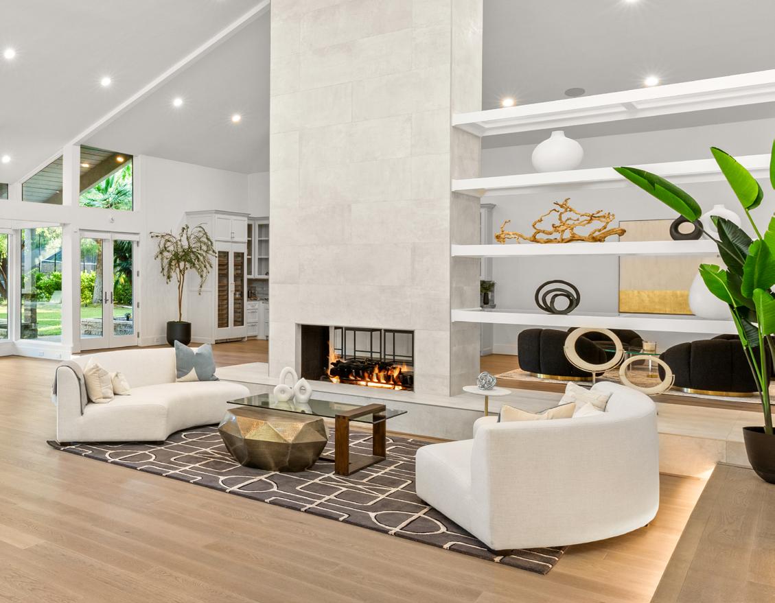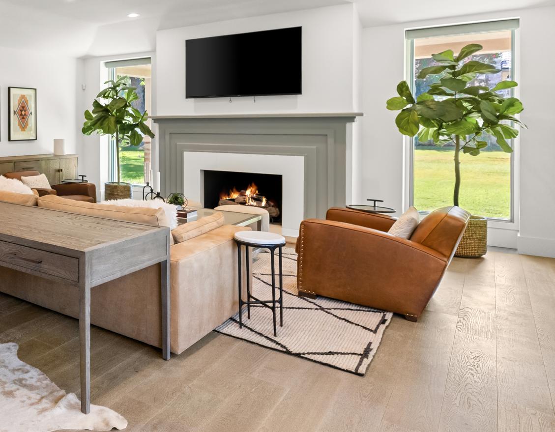 Step inside to discover an airy, light-filled interior, where high vaulted ceilings and floor-to-ceiling windows in the great room create an expansive, open atmosphere. The dual-sized fireplace serves as a stunning focal point, perfect for cozy evenings and gatherings with loved ones.