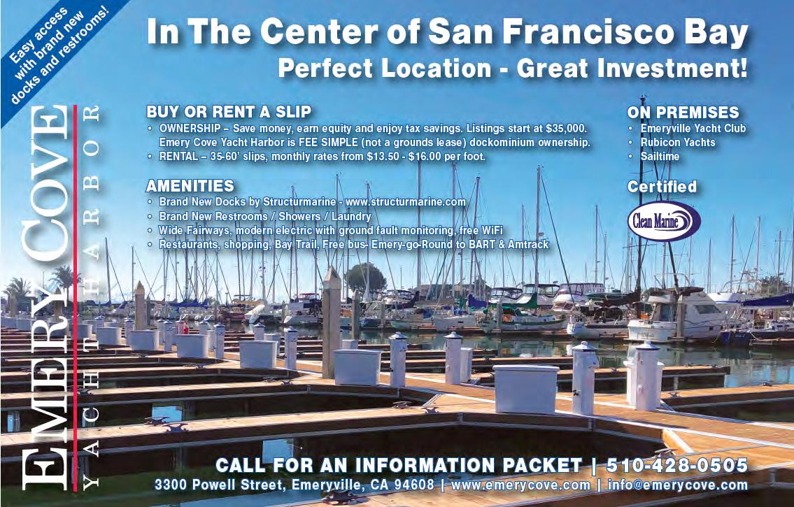EMERY COVE BOAT SLIP FOR RENT. Berths for rent. Emery Cove Yacht Harbor 35-ft = $472.50/month C dock and 40-ft = $540/month E dock. Dockominium-run marina in Emeryville. emerycove.com. Brandnew docks, aluminum with Ipe wood deck, brand-new restrooms, beautiful grounds and just dredged. Great location center of S.F. Bay. Emeryville, CA studio6161@icloud.com http://www. emerycove.com