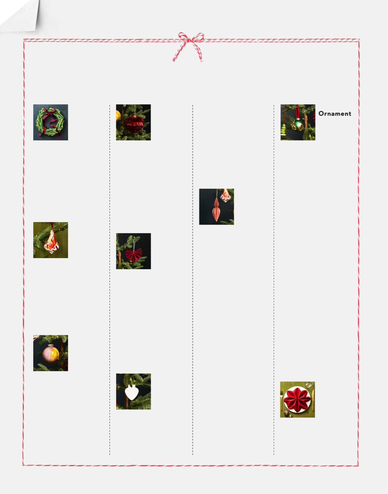 For a f un holiday craf t t hat doubles as decor (or as a gif t!), tr y a t w ist on a trad itiona l Advent ca lenda r, suggests designer Ginger Cur tis of Urba nolog y Designs To ma ke t h is custom i zable version , s t a mp t he 2 4 d ay s onto cra f t bags a nd fi l l t hem w it h treats a nd personalized notes , then seal them w ith red dot stickers a nd h a ng t hem f rom wooden dowels w it h str ing for a l l to enjoy For complete in st r u ct ion s , s ee p age 1 10