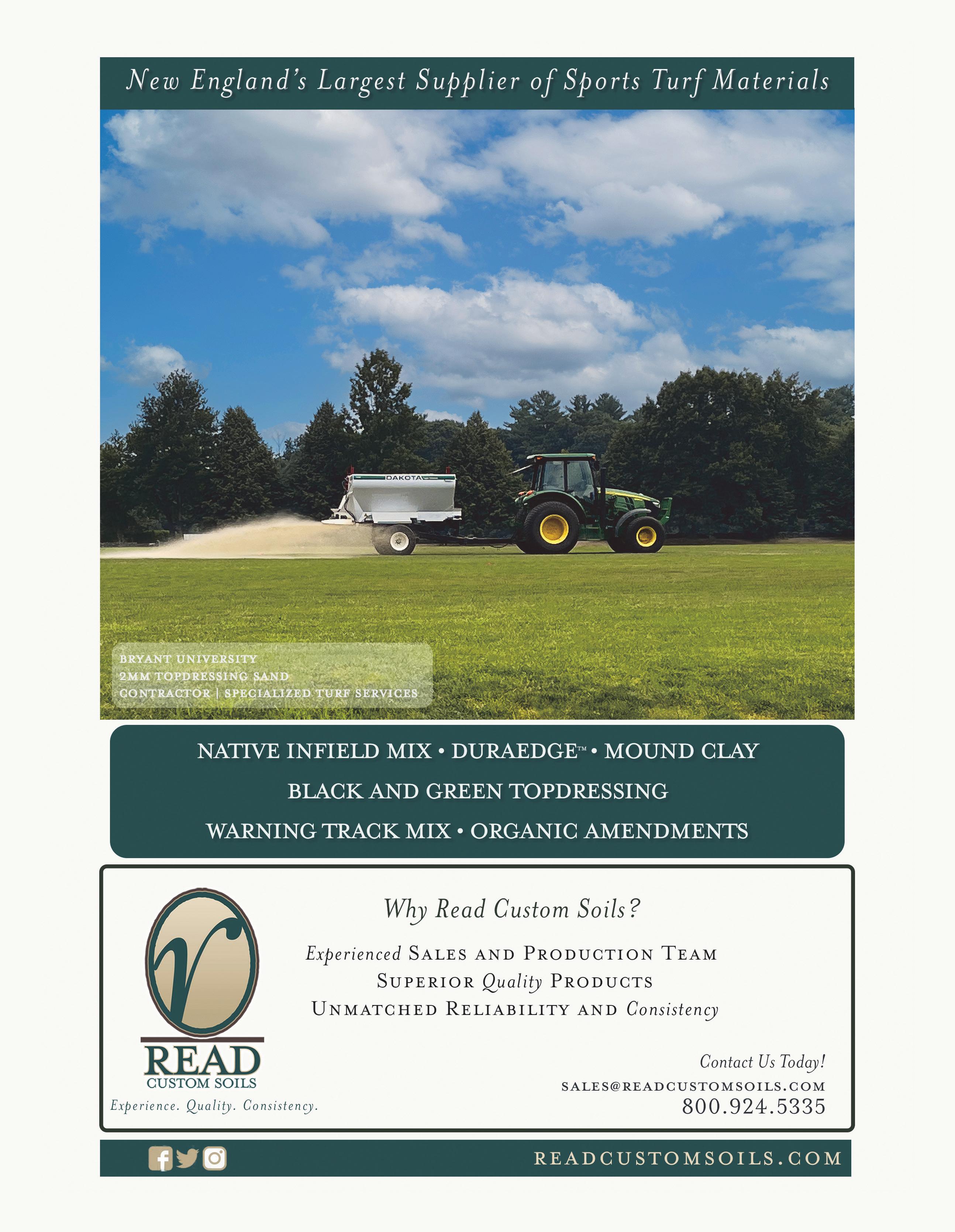 On the cover: Memorial Field in Needham, MA. Ed Olsen says, “This photo represents a busy day of core aeration and core harvesting on a beautiful Fall day after a long baseball season. Edging the skin and prepping the surface for another season!”
