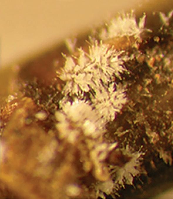 Under humid conditions the boxwood blight pathogen also produces distinct disease signs on affected stems/branches (Fig. 5A) and leaves (Fig. 5B). These include white pathogen masses — conidiophores bearing long, narrow, hyaline asexual spores (Fig. 5B). These pathogen masses are visible with the naked eye or hand lens, and they appear almost crystalline under a dissecting microscope (Fig. 5B). Under the same conditions, the Volutella blight pathogen also develops spore masses that are at first white then gradually turn to salmon color (Fig. 5C). Additionally, the Macrophoma leaf spot pathogen produces black dot-like fruiting bodies on leaf surface (Fig. 5D). Thus, boxwood blight can be easily distinguished from Volutella blight and Macrophoma leaf spot. Like the Volutella blight pathogen, the Macrophoma leaf spot pathogen is an opportunistic, weak pathogen.