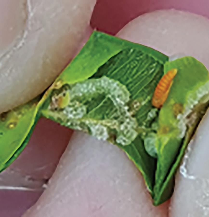 Rapid defoliation (Fig 4) is typical of boxwood blight on severely affected boxwood plants. This symptom separates boxwood blight from Volutella blight and other diseases as well as winter damages. The only other agent known to be capable of causing extensive defoliation is boxwood leafminer (Monarthropalpus flavus). Leafminer feeding on boxwood leaves causes spotting on their upper surface and blisters on the underside. Slicing into these blisters will reveal adults about to emerge (Fig. 3 – left). Also accompanying leafminer infestation is extensive leaf browning (Fig. 3 – right). Boxwood blight does not have any of these symptoms thus can be readily distinguished from leafminer infestation.