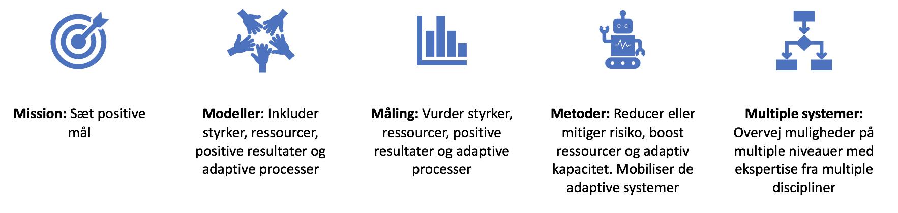 Mission: Sæt positive mål. Traditionel set har mange indsatser handlet om undgå et negativt resultat, fx sygdom eller forebygge problemer. Den nyere resiliensforskning peger på betydningen af at disse reformuleres til positive mål. Dels er disse mål mere motiverende, men samtidig er erfaringen også at fx et mål om fravær af sygdom ikke giver samme resultater som hvis målet er sundhed og livsglæde.