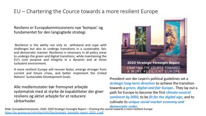 Pandemien har været en fremkaldervæske, der tydeliggjort vores samfunds styrker og svagheder på nationalt, europæisk såvel som globalt plan. Det har skabt en interesse for resiliens som nu opfattes som en nødvendig samfundsmæssig kvalitet. I det følgende udfolder vi, hvorfor resiliens er så vigtig og hvordan nogen af verdens førende demokratiske institutioner forsøger at fremme det. Vi udforsker de vigtigste grundforståelser af, hvad resiliens er, når vi løfter blikket fra udviklingspsykologien og ser ind i en bredere organisatorisk og samfundsmæssig kontekst.