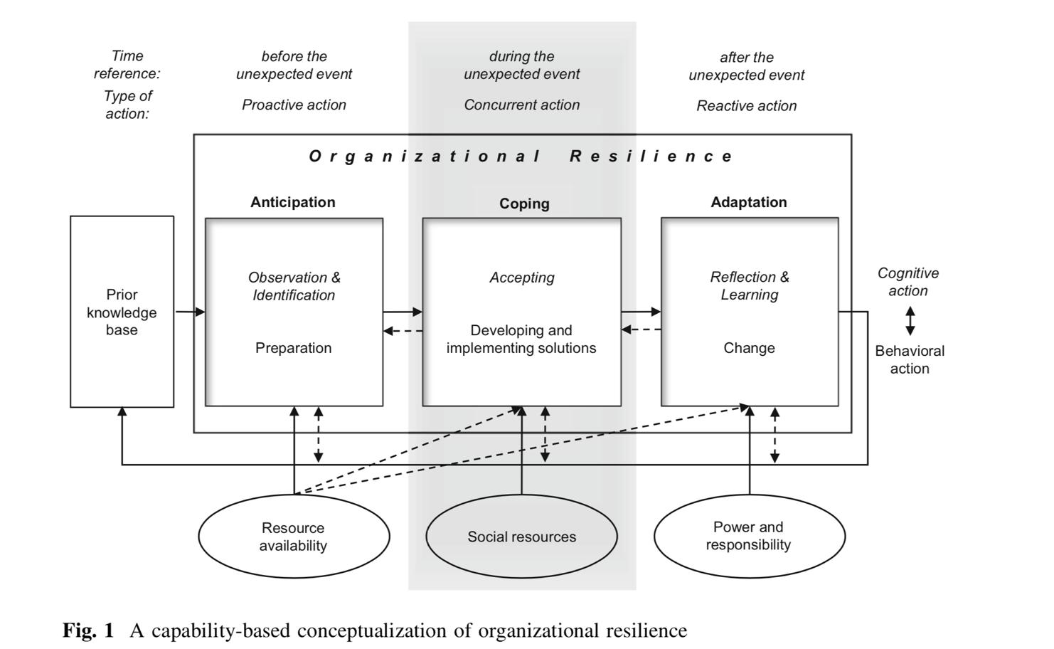 samtidig øge vores vidensbase og dermed kapacitet til at være mere forudseende og endnu bedre i stand til at håndtere den næste krise. Ducheck fremhæver, at succes i hver fase altid rummer interaktion mellem en kognitiv såvel som adfærdsmæssig dimension. Adfærdsmæssigt kræver hver fase handling fx improvisation, eksperimenter og implementering af ny viden. Samtidig er kognitive processer som meningsskabelse, kritisk refleksion og omtanke nødvendige. Uden den ene giver den anden ikke effekt.