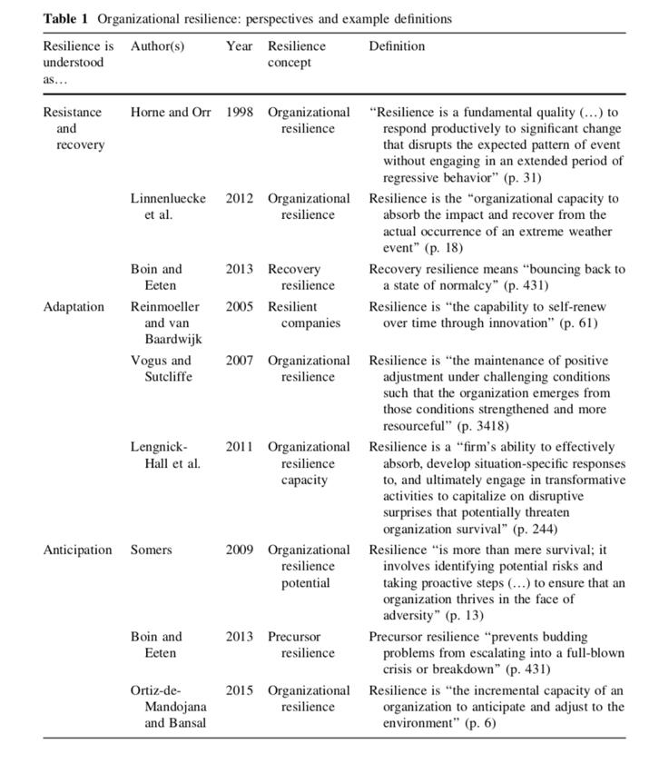 A) En gruppe af forskere forstår resiliens som en organisations evne til at stå igennem modgang og/eller evnen til at komme sig efter disruptioner og vende tilbage til en normal tilstand.