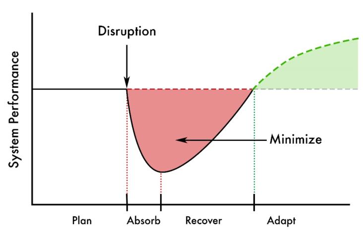 Resiliens involverer, hvordan et system planlægger og forbereder sig, modstår og absorberer, kommer sig oven på og tilpasser sig til diverse disruptioner og trusler. .