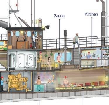 Dieses Boot ist etwas, das Sie sich nie hätten vorstellen können, wenn Sie es einmal erlebt haben. Äußerlich sieht die MS Vulkana immer noch aus wie ein traditionelles norwegisches Fischerboot. Wenn Sie es betreten, finden Sie diese wunderschönen Räume, die vom genialen Architekten Sami Rintala geschaffen wurden: die holzbefeuerte Sauna mit Blick auf das Meer, den Whirlpool an Deck, in dem man sich aufwärmen kann, bevor man ins Polarmeer eintaucht – die Zen Lounge und das türkisch inspirierte Hamam unter Deck, wo man Sie sich nach einem traumhaften Golftag in atemberaubender arktischer Natur entspannen kann. Und das Herzstück des Bootes ist der massive Holztisch, an dem sich am Abend alle treffen. Hier genießt man dann auch die selbstgefangenen Fische und die herrlichen frischen Köstlichkeiten des Küchenchefs. „Es geht nicht darum, sich zurückzulehnen und sich verwöhnen zu lassen. Es ist ein aktives, großartiges Erlebnis. Es geht darum, dass sowohl die Gastgeber als auch die Gäste Gedanken und Erfahrungen miteinander austauschen. Dass dieses besondere Abenteuer verbindet und dem Geist und der Seele Platz für Entfaltung lässt. «