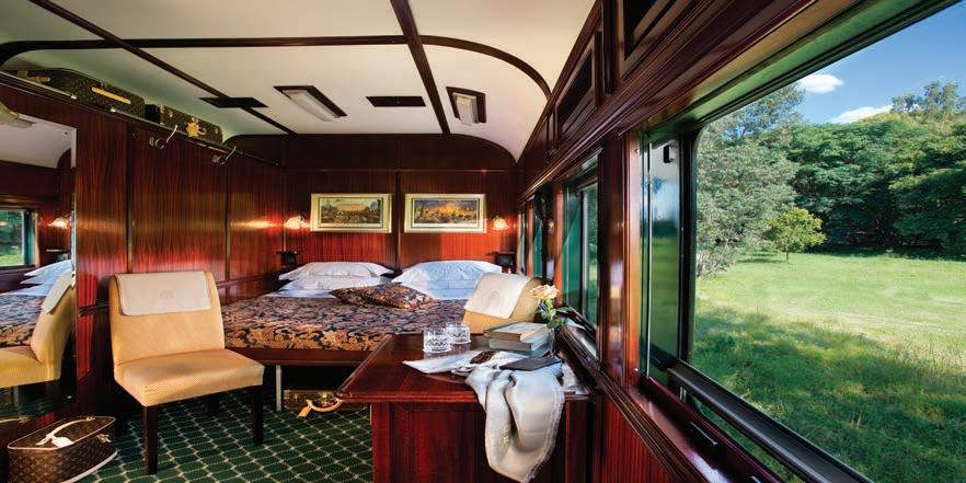Auf dieser von uns maßgeschneiderten und exklusiven Zugfahrt erleben Sie 10 faszinierende Tage kombiniert mit wunderschönen Gol agen und/oder einer Vielzahl von Ausflügen außerhalb des Zuges. Steigen Sie in diesen holzgetäfelten Oldtimer und lehnen Sie sich zurück, während sich hinter den Fenstern eine der abwechslungsreichsten Landscha en entfaltet, die man sich vorstellen kann.