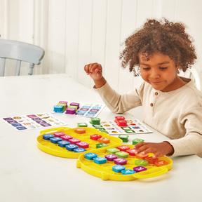 Get ready for some earth-friendly learning fun! Made from recycled materials, these colourful bees are ready to help little ones build essential early years skills. Little hands open the petals of the wibbling, wobbling flower and use the included fine motor tongs to pick up the bees and place them on the petals, building strength in the muscles of their hands and wrists as well as hand-eye coordination skills as they go. The flower and bees can also be used for counting and colour recognition activities. After playtime is over, the tongs and bees store inside the flower ready for next time. Includes flower with hinged petals, base, tongs and 25 bees. The Activity Guide and packaging are multilingual. Closed flower measures 13cm L x 17cm H. 28 Piece Set SMALL PARTS. Not for < 3 yrs