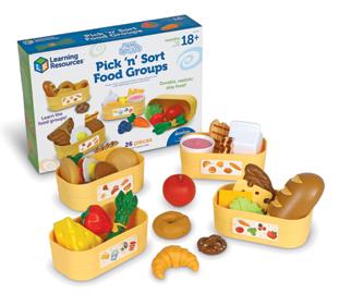 This set of toy play food is ready to teach little ones a range of early years skills through imaginative play. Children reach for the storage baskets, and then sort the 21 different food pieces while learning about healthy food choices along the way. There are 4 baskets, 5 protein foods, 6 fruits and veg, 5 grains, and 5 dairy foods. These play food pieces are also ideal for pretend shop and kitchen play activities. Sized for little hands, our New Sprouts® play foods are made from high quality durable materials and finished to a high standard. They are easy to wipe clean and are ideal for use in classrooms, play groups, and at home for food-themed imaginative play. Packaging is multilingual. A basket 15cm L x 9cm W. 26 Piece Set