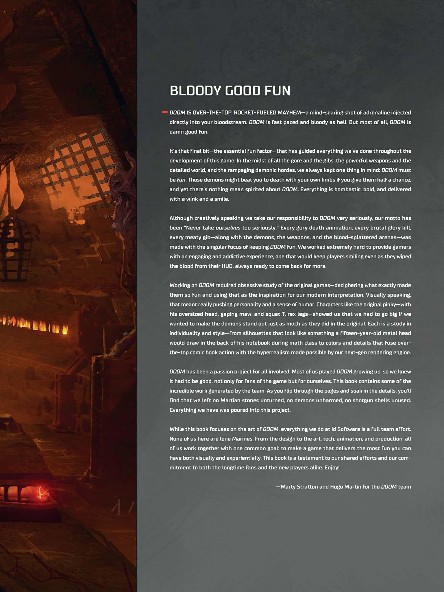 Desde las inmensas instalaciones de la UAC en Marte hasta las profundidades del infierno, descubre bocetos y arte conceptual nunca antes vistos de DOOM. El libro también incluye una mirada exclusiva al desarrollo de los implacables demonios del infierno, las devastadoras y exageradas armas y el icónico marino de DOOM, todo ello acompañado de comentarios de los propios desarrolladores. El arte de DOOM es indispensable para los aficionados a los videojuegos, al combate visceral en primera persona y a la acción trepidante.