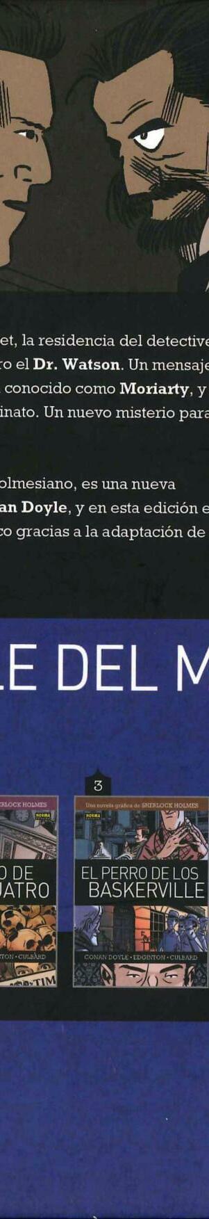 Un mensaje cifrado llega al 221B de Baker Street, la residencia del detective consultor Sherlock Holmes y su fiel compañero el Dr. Watson. Un mensaje que parece estar relacionado con el genio criminal conocido como Moriarty, y que, sorprendentemente, predice un supuesto asesinato. Un nuevo misterio para la mente inquieta de Holmes. El valle del miedo, la cuarta novela del canon holmesiano, es una nueva oportunidad para disfrutar del ingenio de Conan Doyle, y en esta edición en cómic, una nueva forma de gozar de este clásico gracias a la adaptación de Ian Edginton y al arte de I.N.J. Culbard.