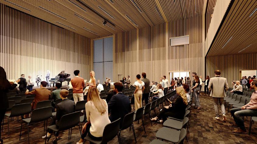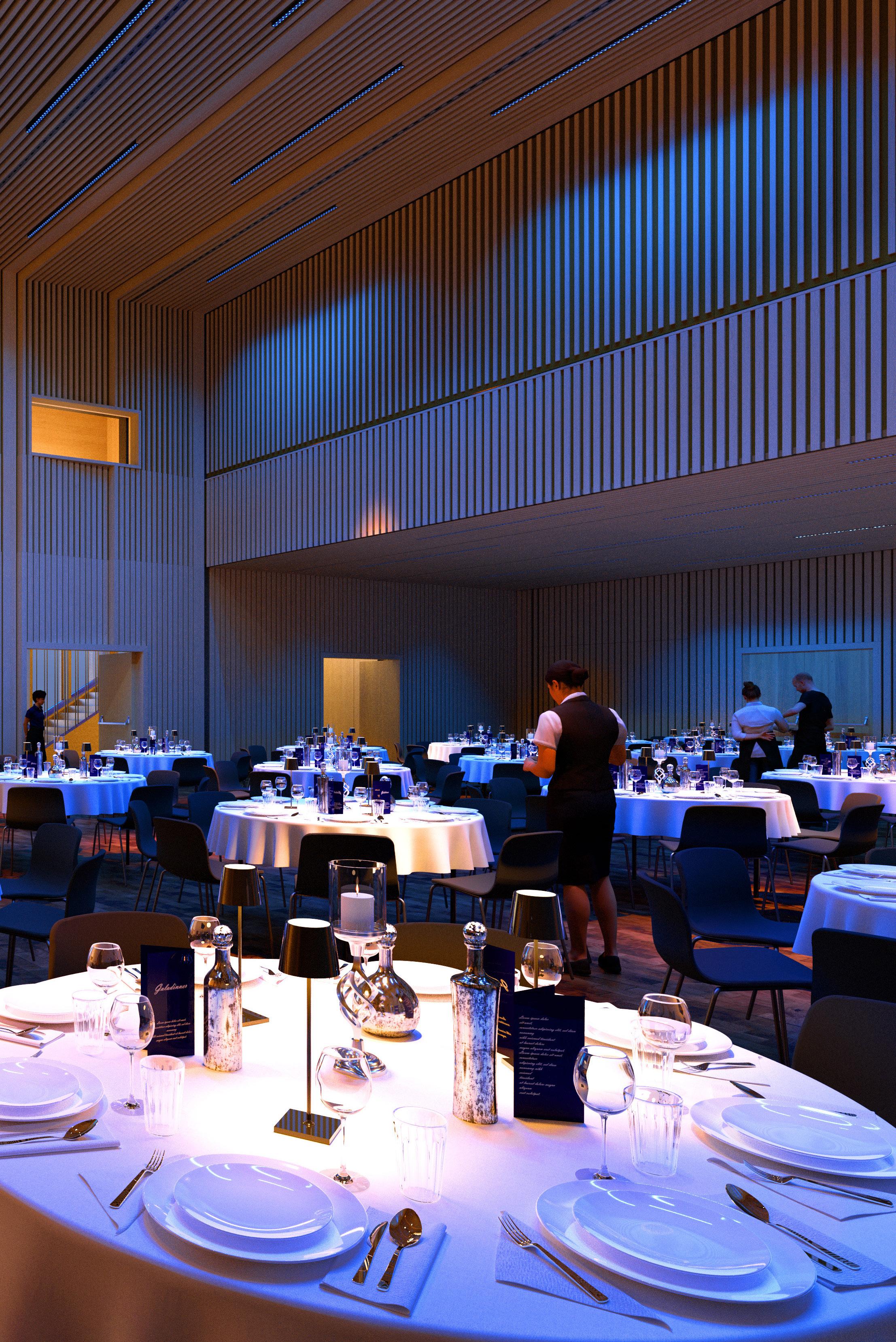 So klar und transparent wie die Philosophie des Hauses ist auch seine Architektur: Hinter der Fassade aus Glas und Holz entstehen flexibel nutzbare Räume für Tagungen, Konzerte und Events aller Art. Herzstück ist der multifunktionale Veranstaltungssaal für bis zu 650 Besucher:innen, der bei Bedarf in bis zu drei kleinere Säle geteilt werden kann. Ausgestattet mit modernster Technik, die alle Stücke spielt.
