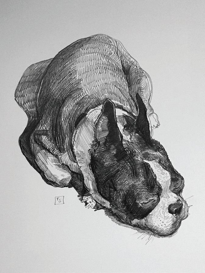 His works showcase these e orts, from a row of old seaside houses sandwiched between dramatically churning sky and surf, to a simple but starkly rendered drawing of a Boston Terrier. Spande describes them as “lively watercolors, perhaps in the tradition of Winslow Homer, and detailed and well-worked pencil drawings.”