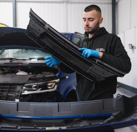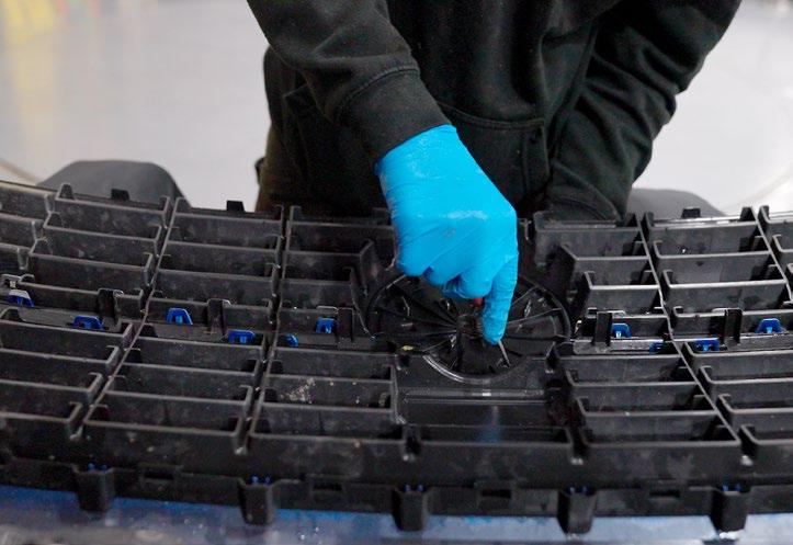 Placera stötfångaren från LV-R på en täckt bock och använd ledstiften för att fästa mittgrillen.