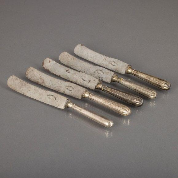 Em casquinha, metal prateado e vidro, de diferentes origens, uma aneleira com inscrição, taça vazada com elementos vegetalistas (vidro com cabelos). Sinais de uso.