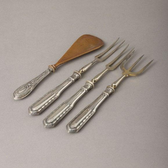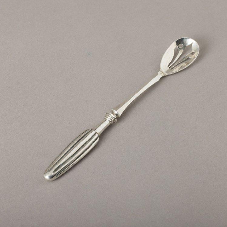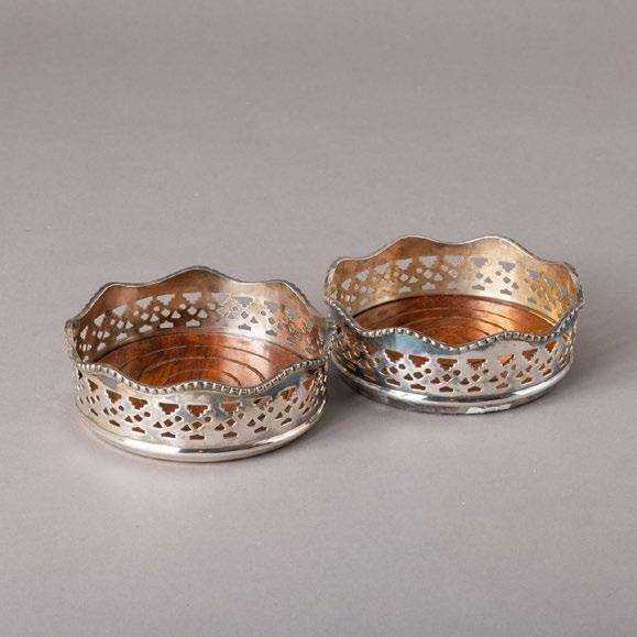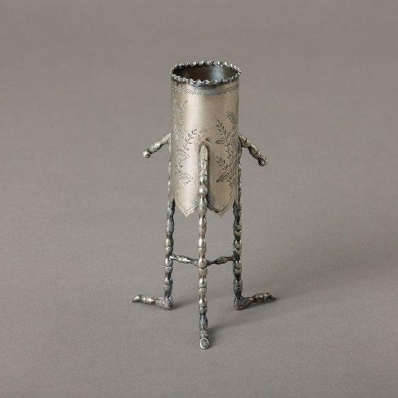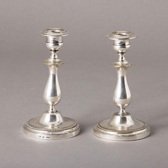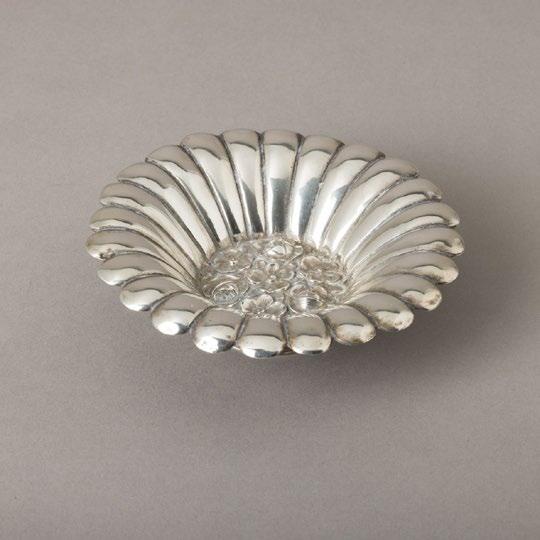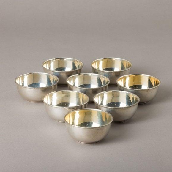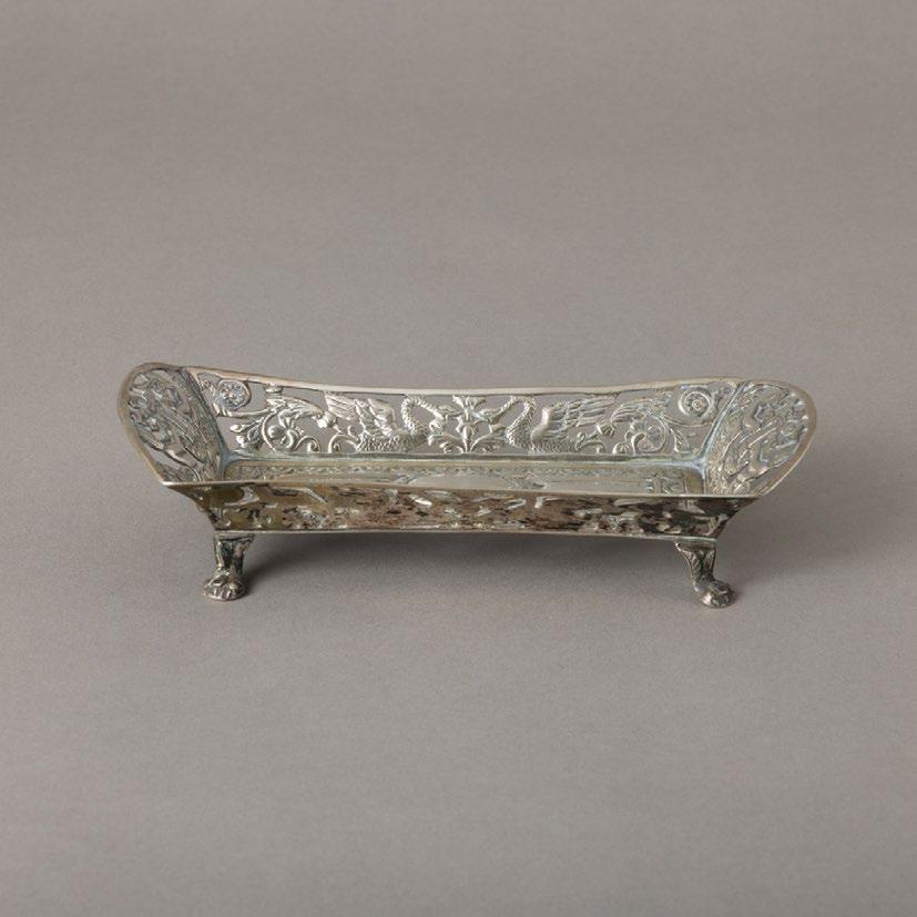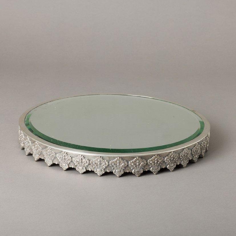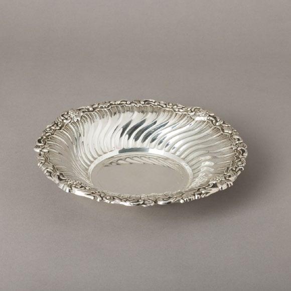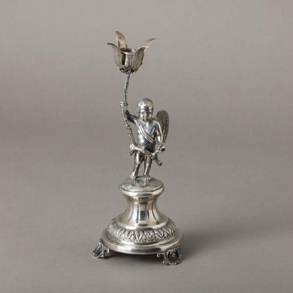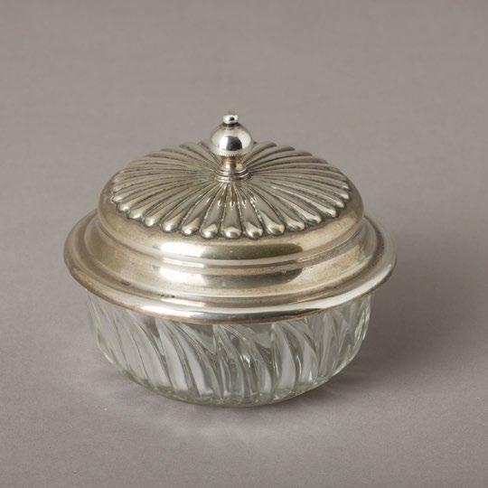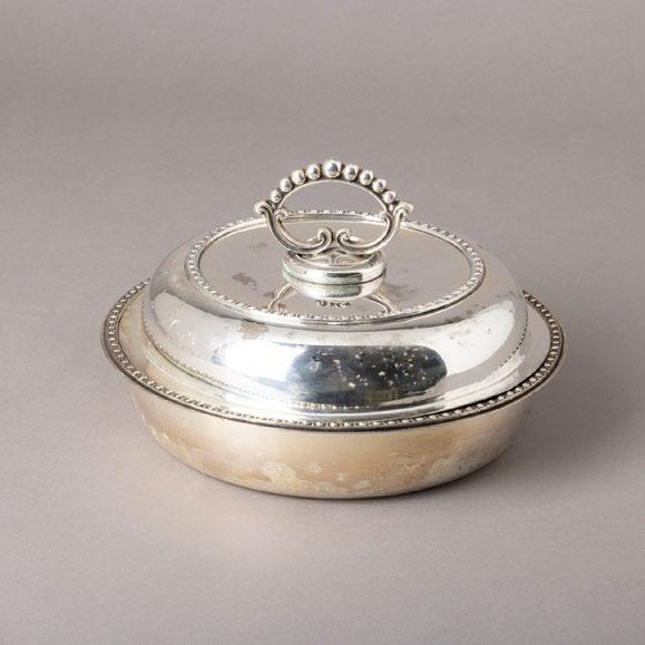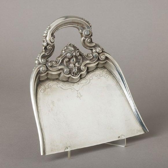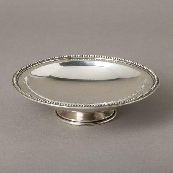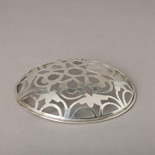 Em metal prateado, decorado com frisos perlados, pega amovível. Sinais de uso e leves pontos de oxidação.