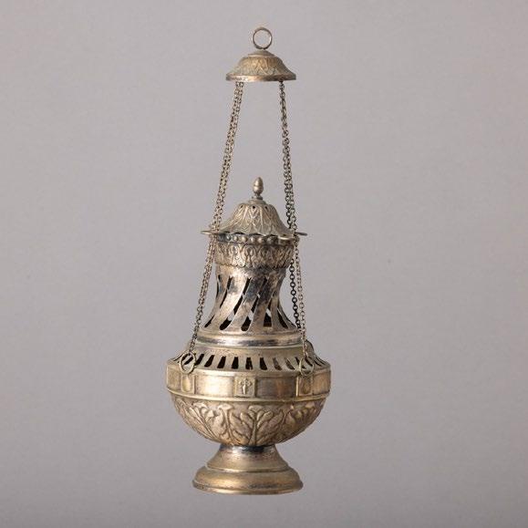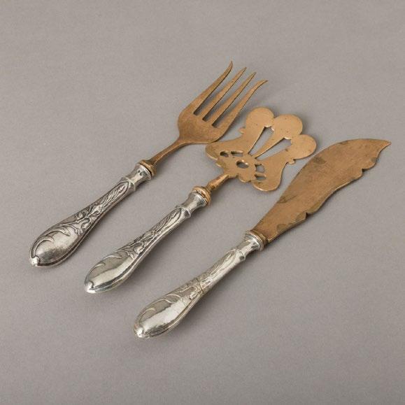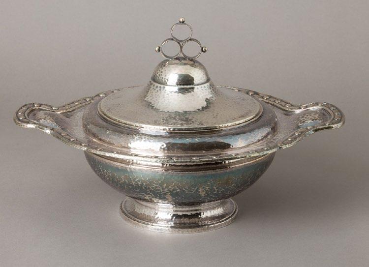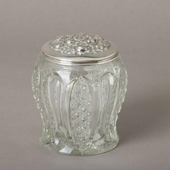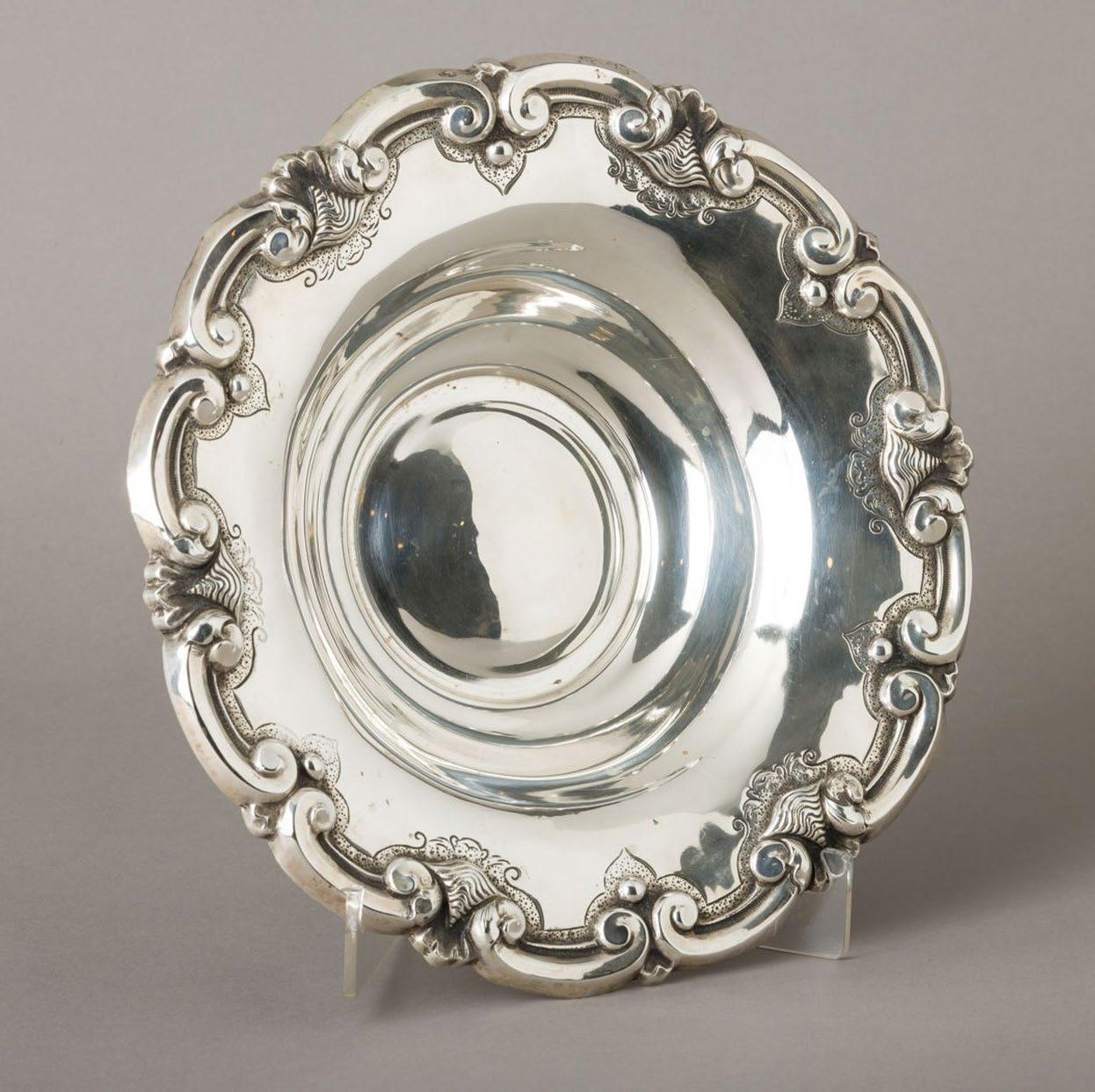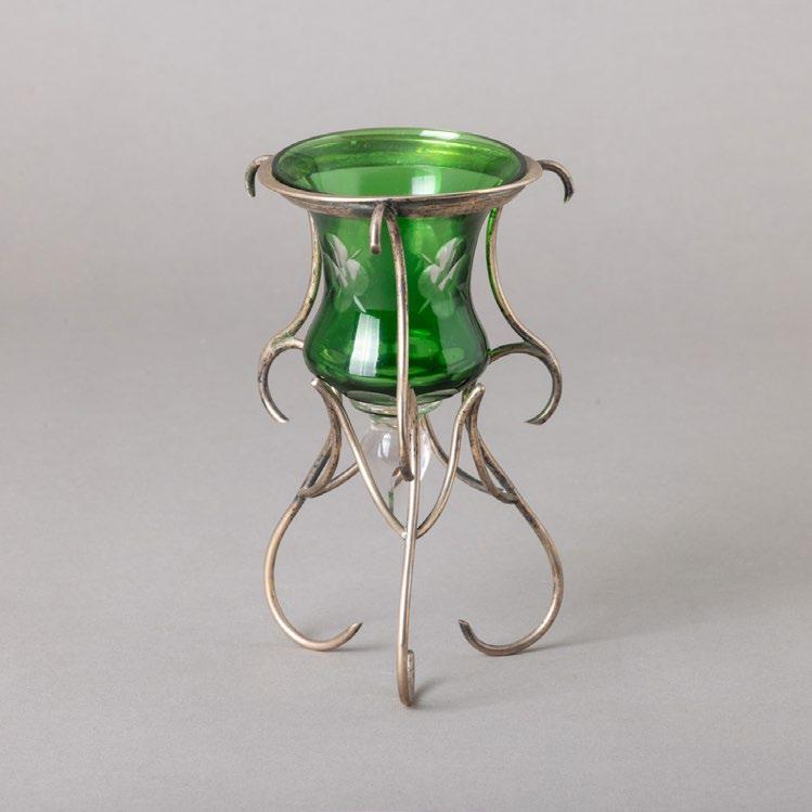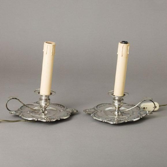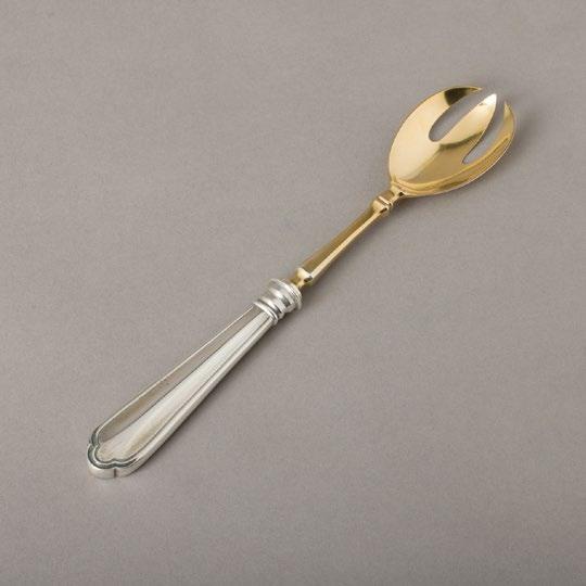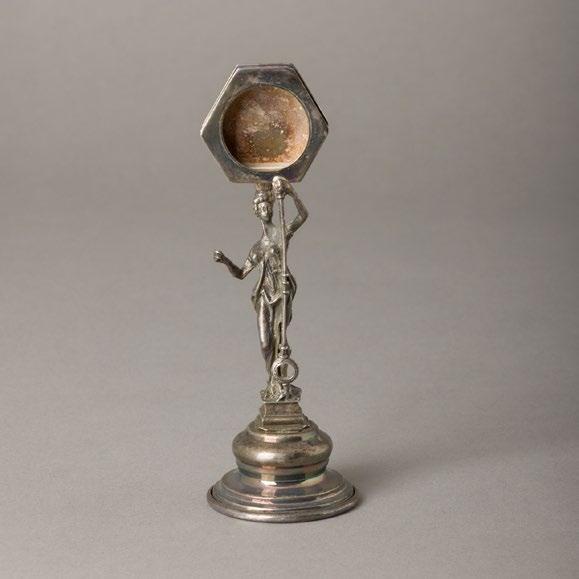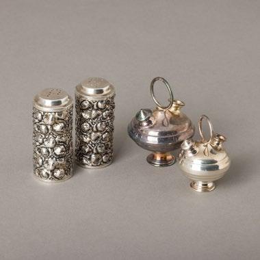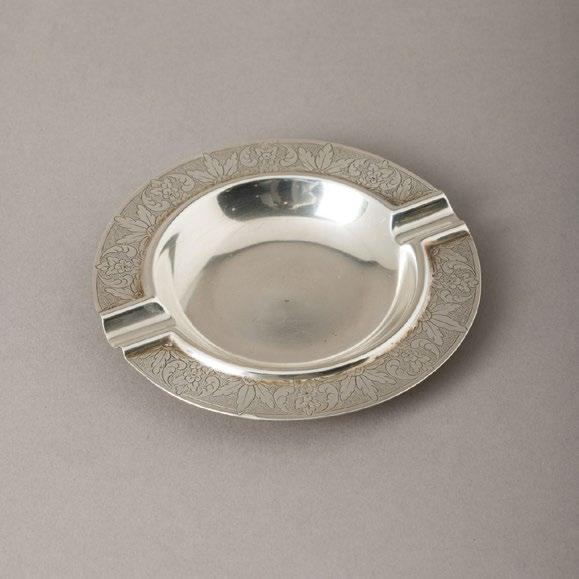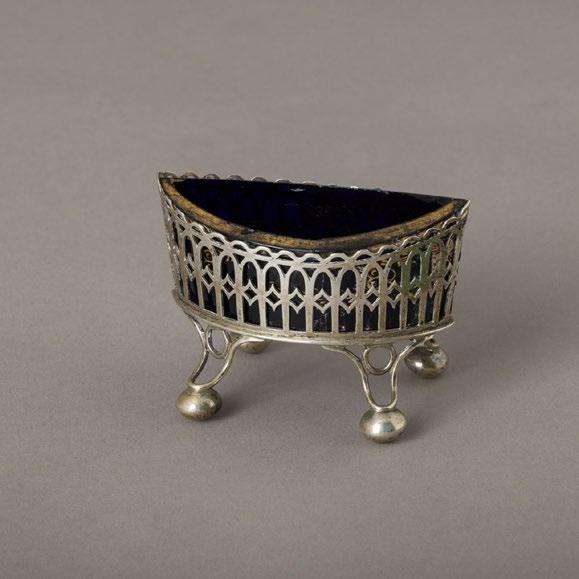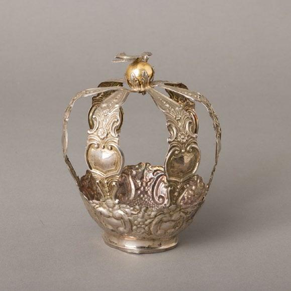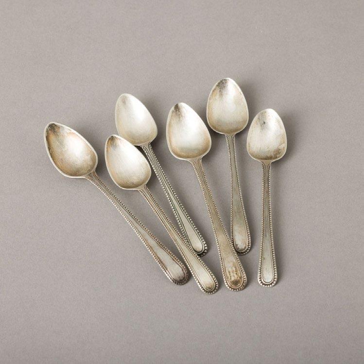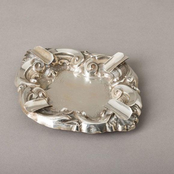 Em metal prateado, decorado com frisos perlados, pega amovível. Sinais de uso e leves pontos de oxidação.