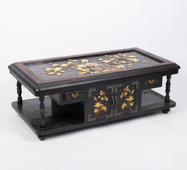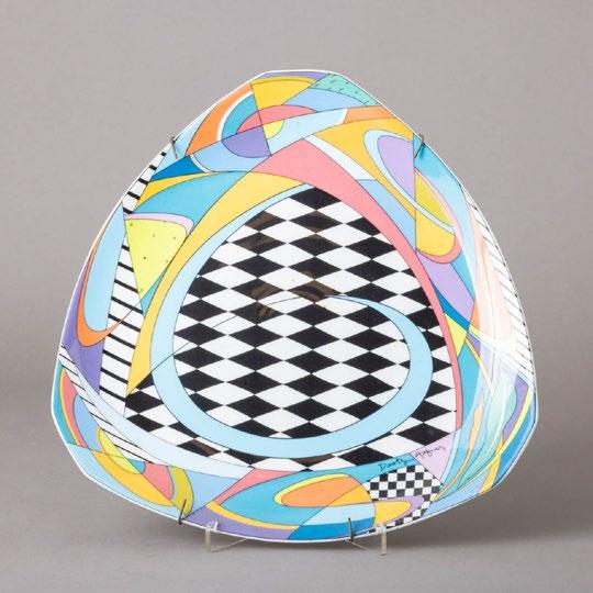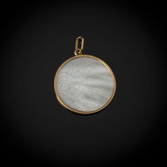 Em casquinha da Topázio, decoração relevada e vazada, base em acrílico. Marcada. Sinais de uso.