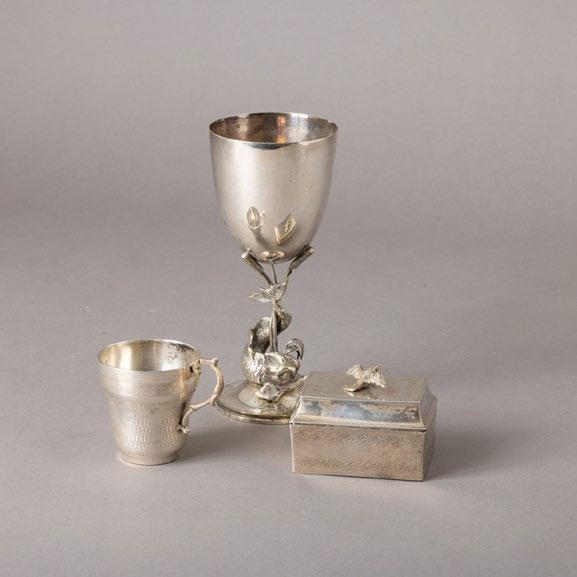 Em metal prateado, decoração relevada e gravada diversa, cálice marcado Mappin & Webb´s. Sinais de uso.