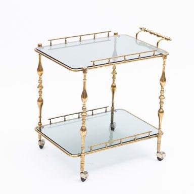 Em metal dourado, de dois níveis, tampos em vidro fumado. Pequenos defeitos, sinais de uso.
