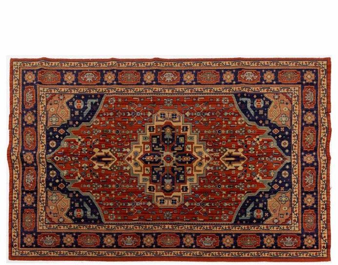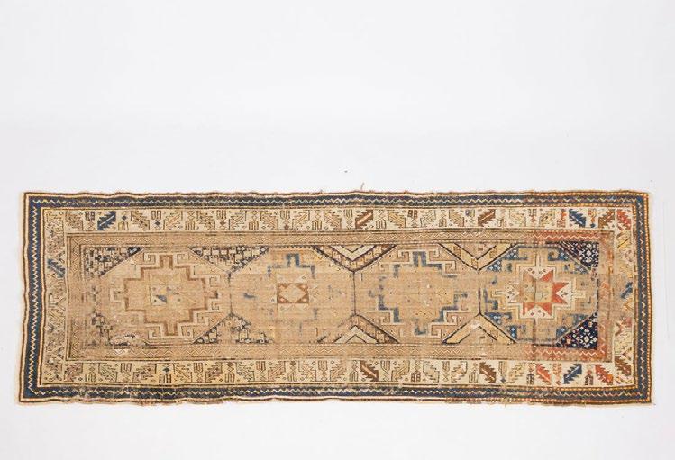 Em lã e algodão de tons policromos com elementos florais e geométricos. Sinais de uso e rasgões nas pontas.