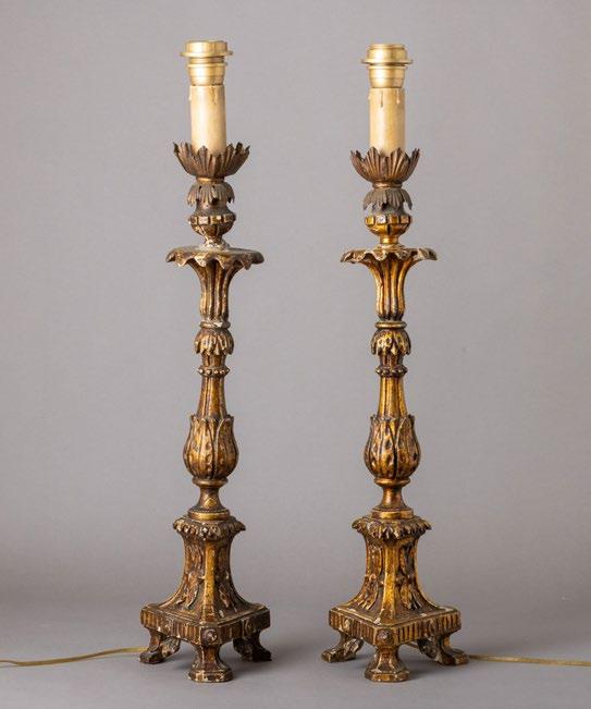 Em metal amarelo, decoração relevada com frisos vegetalistas, fuste gomado. Sinais de uso, levemente oxidado.