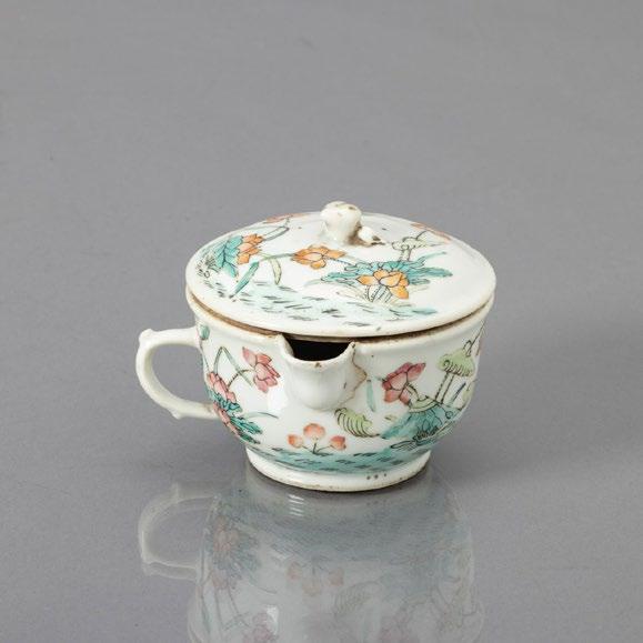 Em porcelana moldada, decoração relevada e policromada com laços e flores, na tampa menino pescador. Pequenas falhas, restauros