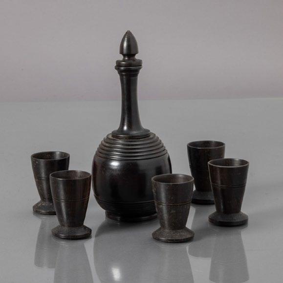 Em estanho. Composto por caixa, taça recortada, dois copos e apanha migalhas. Sinais de uso e um copo com amolgadelas.