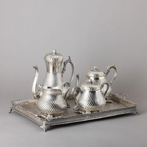Em metal prateado, decoração relevada e gomada, composto por bule, cafeteira, leiteira e açucareiro, tabuleiro de gradinha vazada. Sinais de uso.