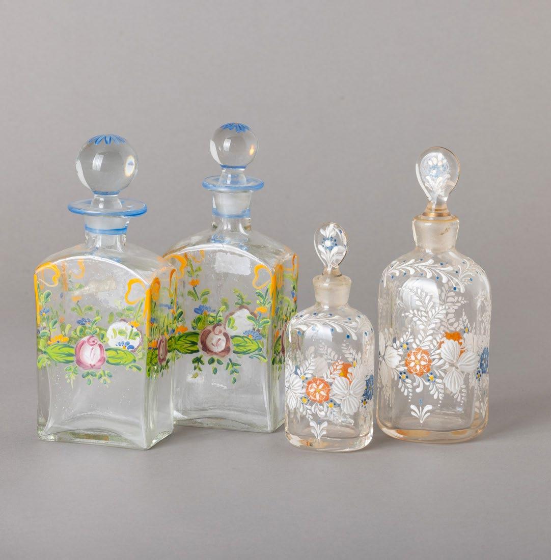 Em cristal, duas Atlantis uma com gargalo em prata portuguesa contraste águia (pós 1985) de 925 marcada Topázio e outra italiana, Mario Cioni, decoração diversa. Sinais de uso.