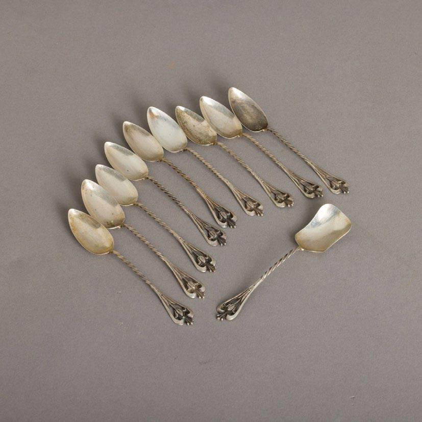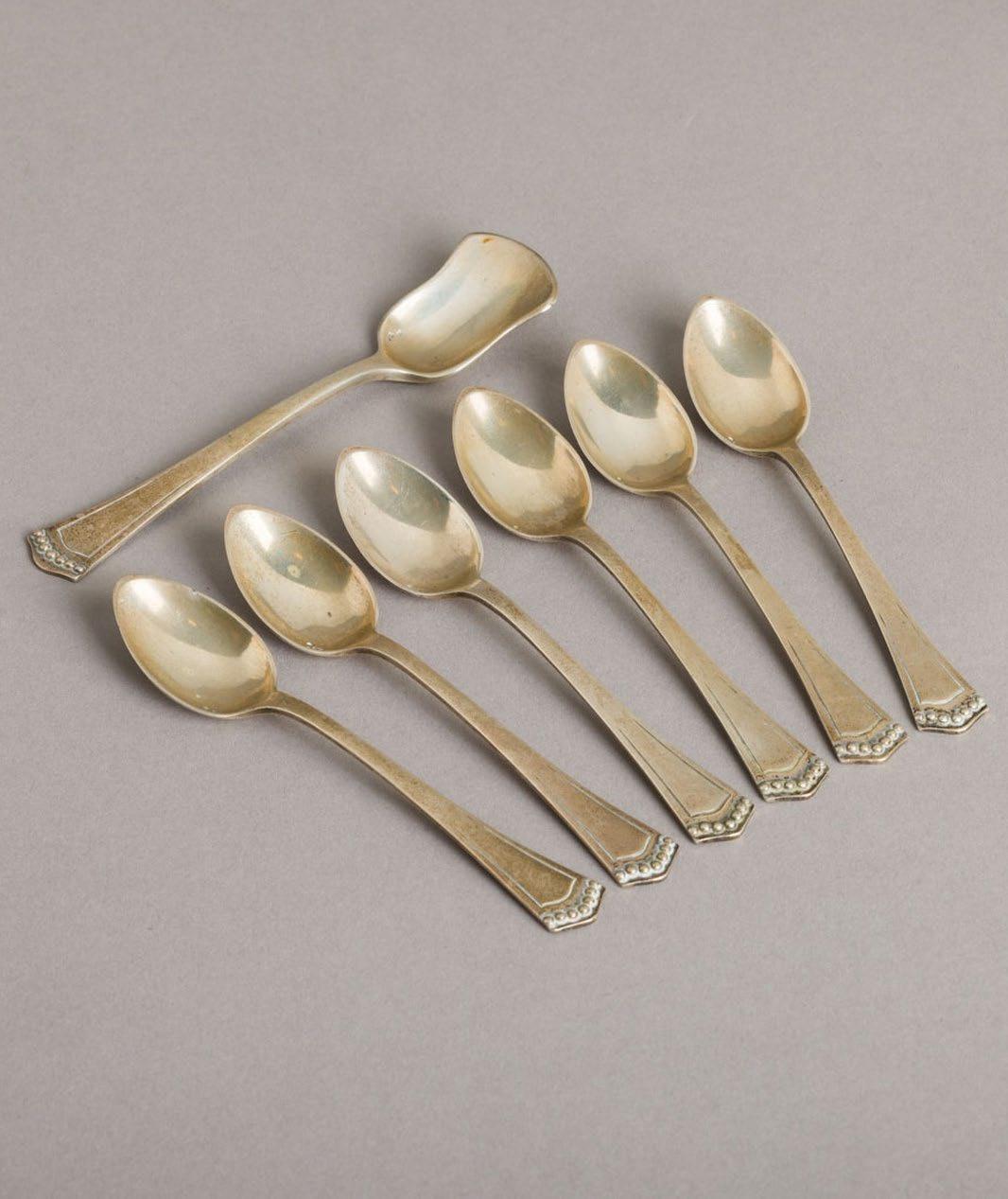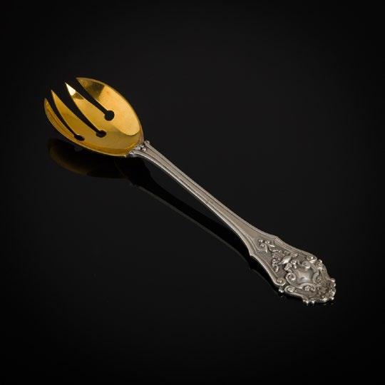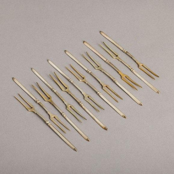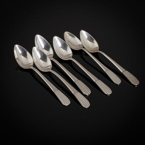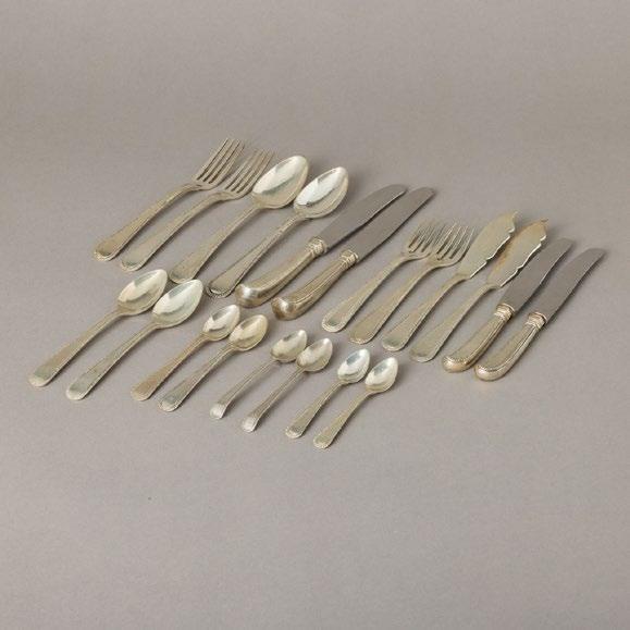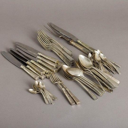 Em aço inoxidável 18/8, decoração com friso de perlados. Alemão. Composto por 12 talheres de carne, 12 de peixe, 12 de sobremesa, 12 colheres de sopa, 11 de sobremesa, 12 de chá, 12 de café, colher de arroz, concha de sopa e de açúcar. Sinais de uso.