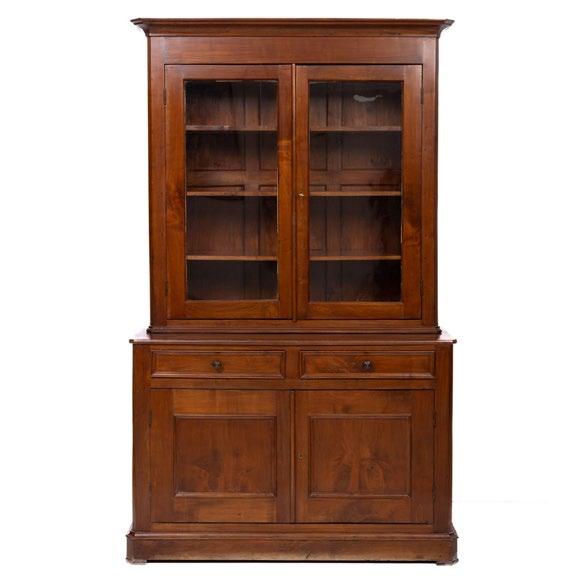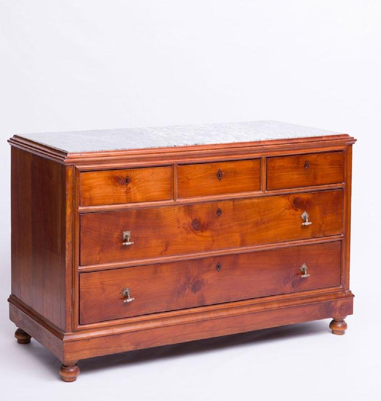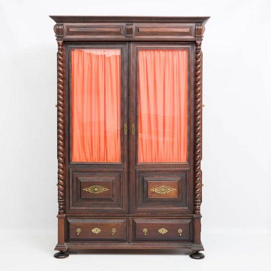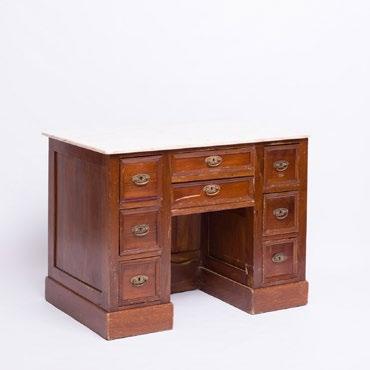 Em diferentes madeiras, de oito gavetas e armário expositor com duas portas em vidro, puxadores em metal e tampo de mármore. Falhas, defeitos e vestígios xilófagos.