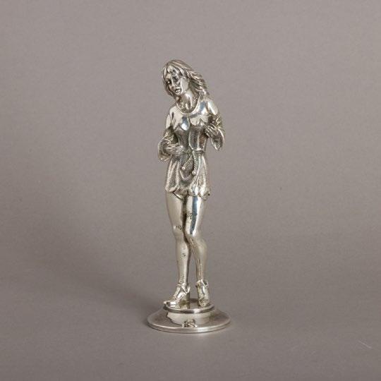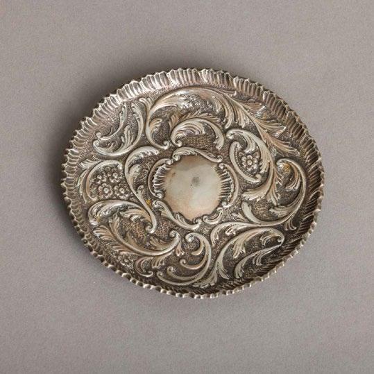 Em metal prateado, decoração relevada e gravada. Marcada. Inglesa. Sinais de uso.