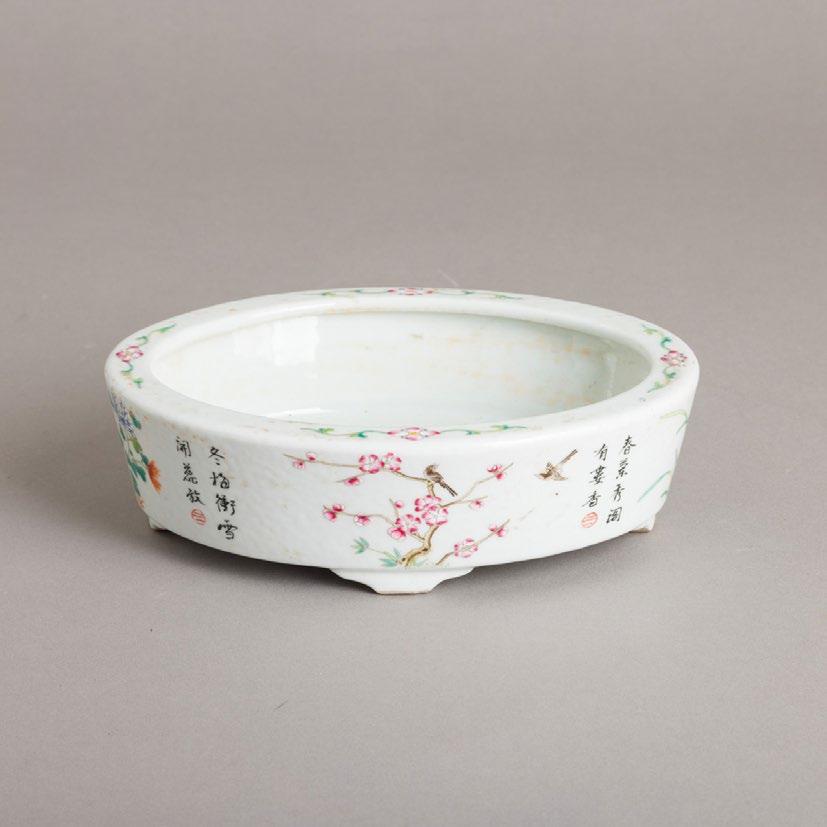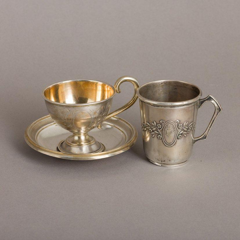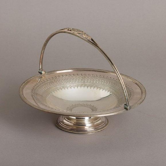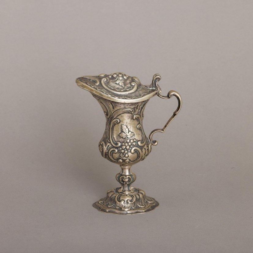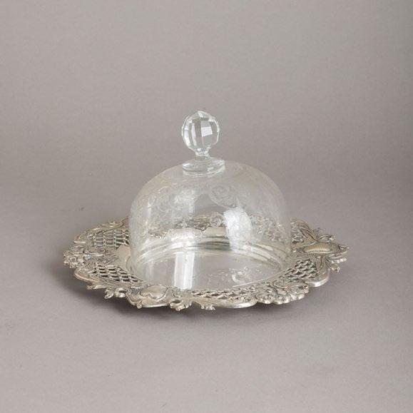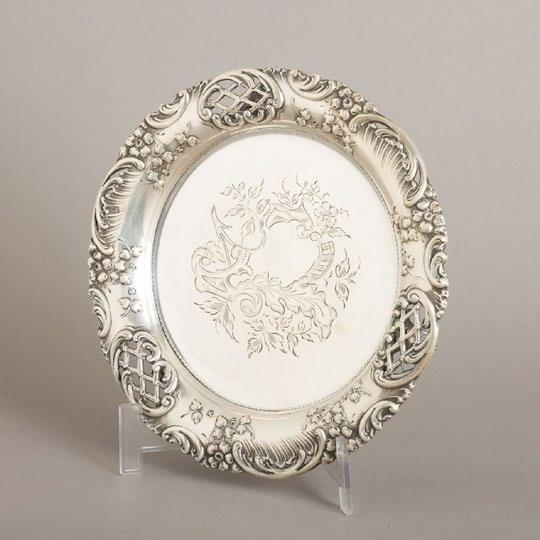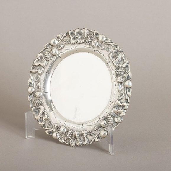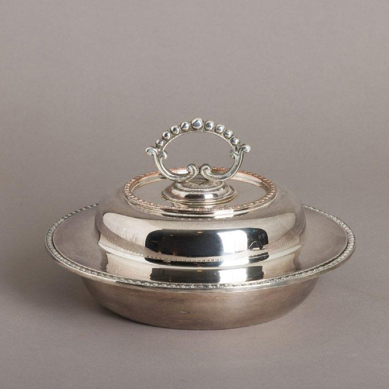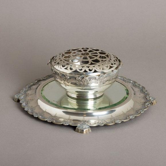 Em metal prateado, bordo relevado com friso de perlados, pega amovível. Tampa com desgaste, base com amolgadela.