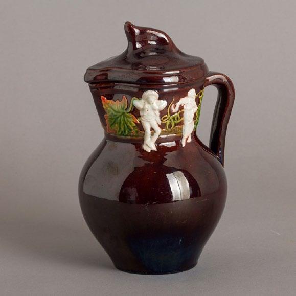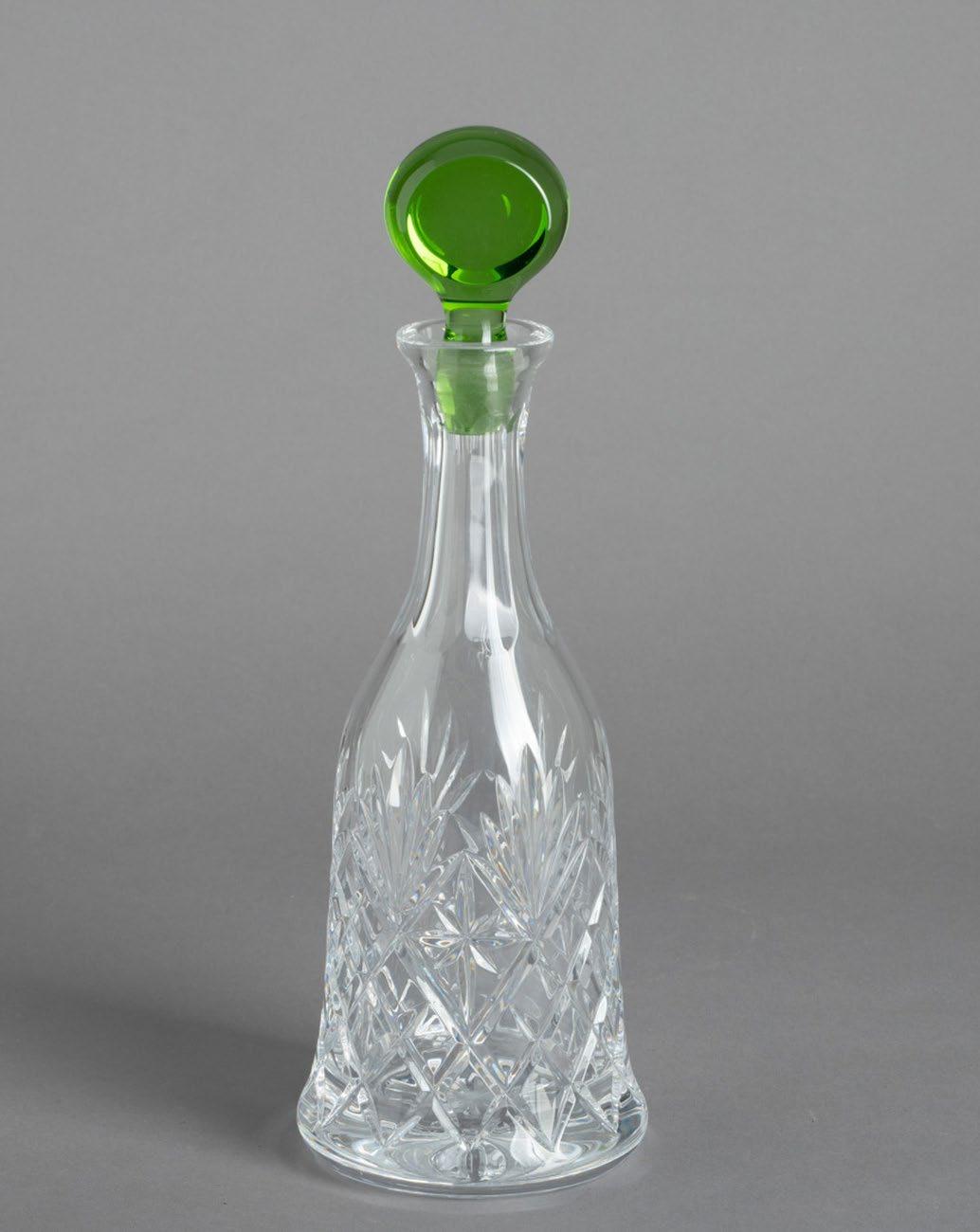 Em vidro moldado, com gargalo, tampa e pega em metal prateado. Sinais de uso, restauros na tampa.