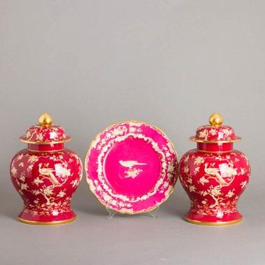 Em porcelana alemã, Graf von Henneberg, decoração a bordeaux e a dourado com folhagem. Composto por 24 pratos rasos, 12 fundos, 12 sobremesa, 4 travessas, prato de servir, terrina, molheira, saladeira, cafeteira, leiteira, açucareiro, 12 chávenas de café