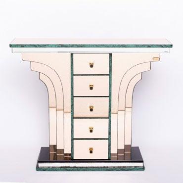 Em madeira revestida a vidro espelhado, frisos simulando baquelite, de cinco gavetas. Italiana. Pequenas falhas e pequenos defeitos.