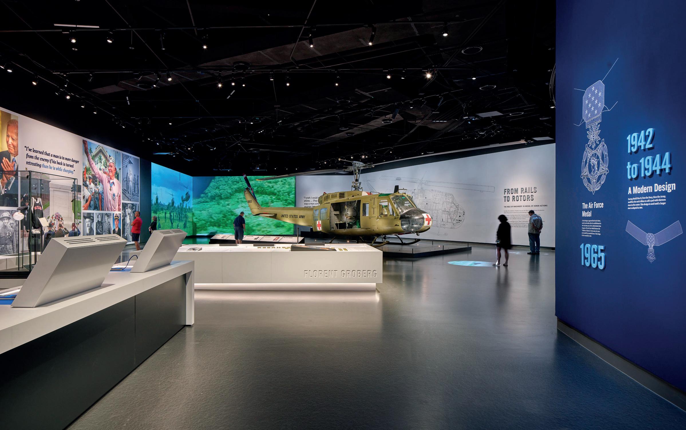The exhibition design is by experience design studio Gallagher &Associates. Exhibits include a restored Vietnam-era Huey helicopter, interactive panoramic scenes, displays of personal artefacts, a virtual helicopter flight simulation and largescale graphics depicting the biographies of Medal of Honor Recipients. An interactive display features interviews with 61 Medal of Honor recipients, while the More than a Medal exhibit explores the ordinary lives of recipients.