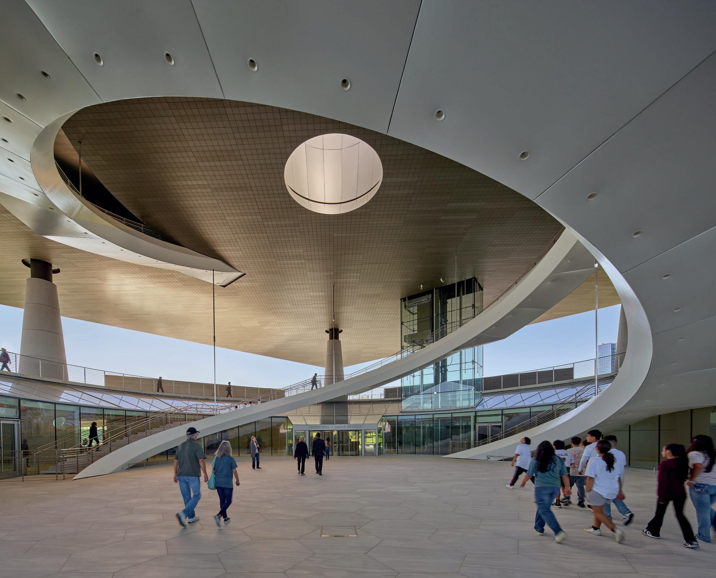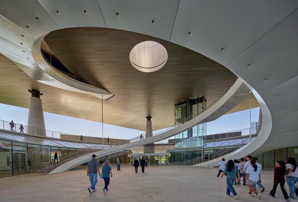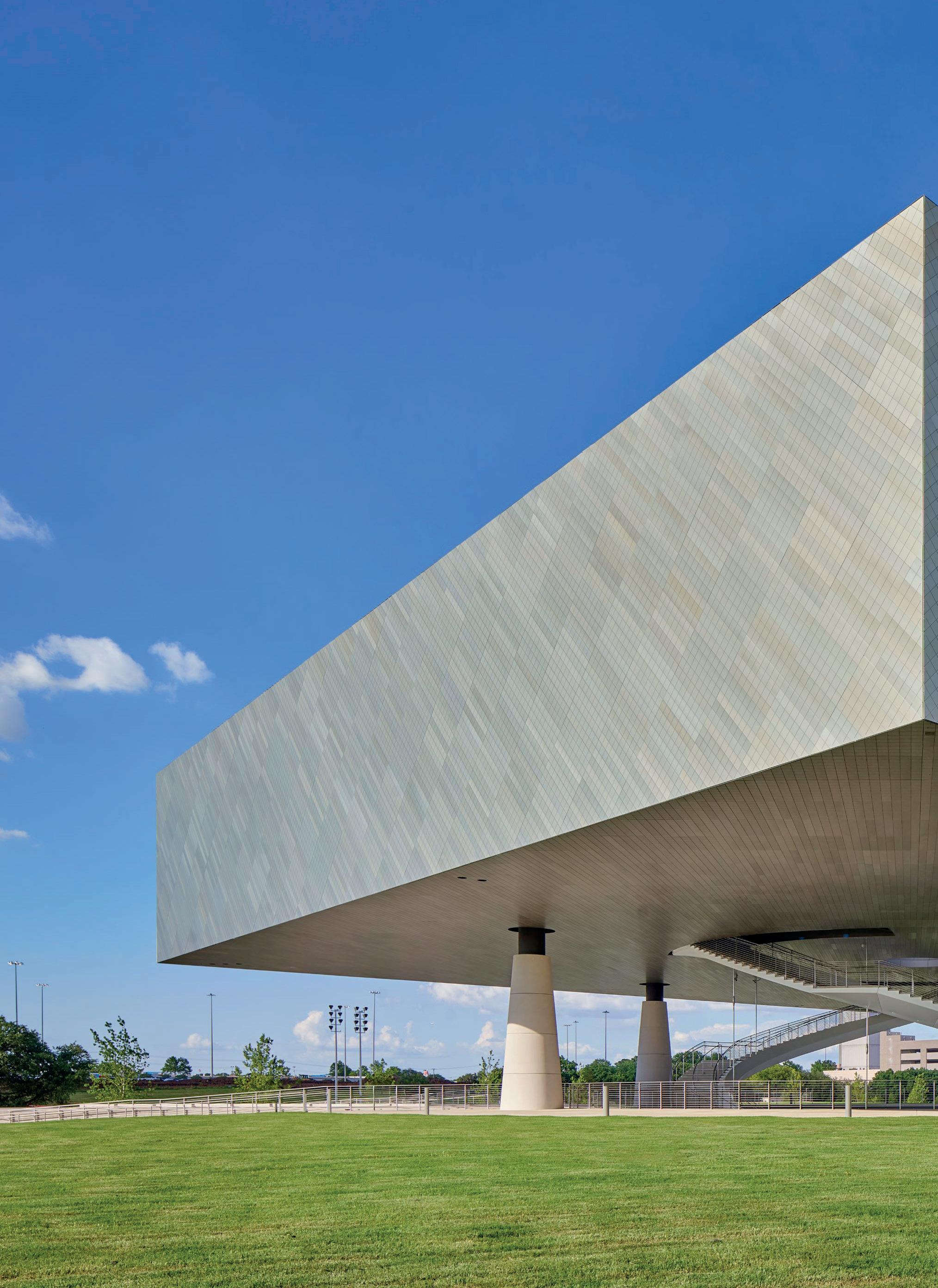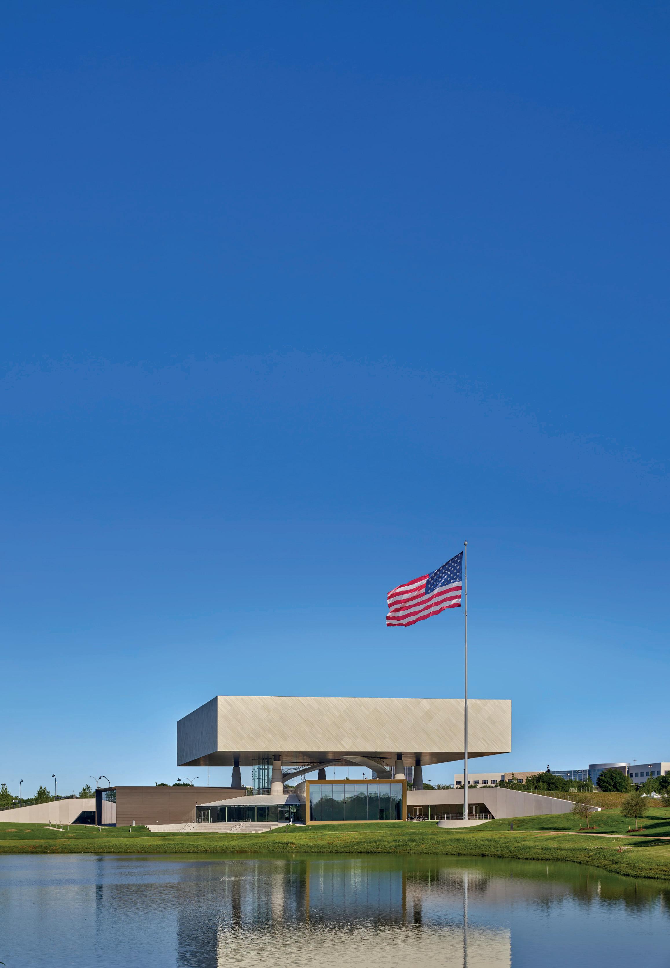 The museum comprises a large 200ft by 200ft exhibition hall housed inside a metalclad structure lifted into the air, supported by five large columns that each represent one of the traditional branches of the US Armed Forces (Air Force, Army, Coast Guard, Marine Corps, and Navy). The sixth branch, US Space Force, is represented by a large oculus that pierces the suspended volume and brings natural light into the core of the building.