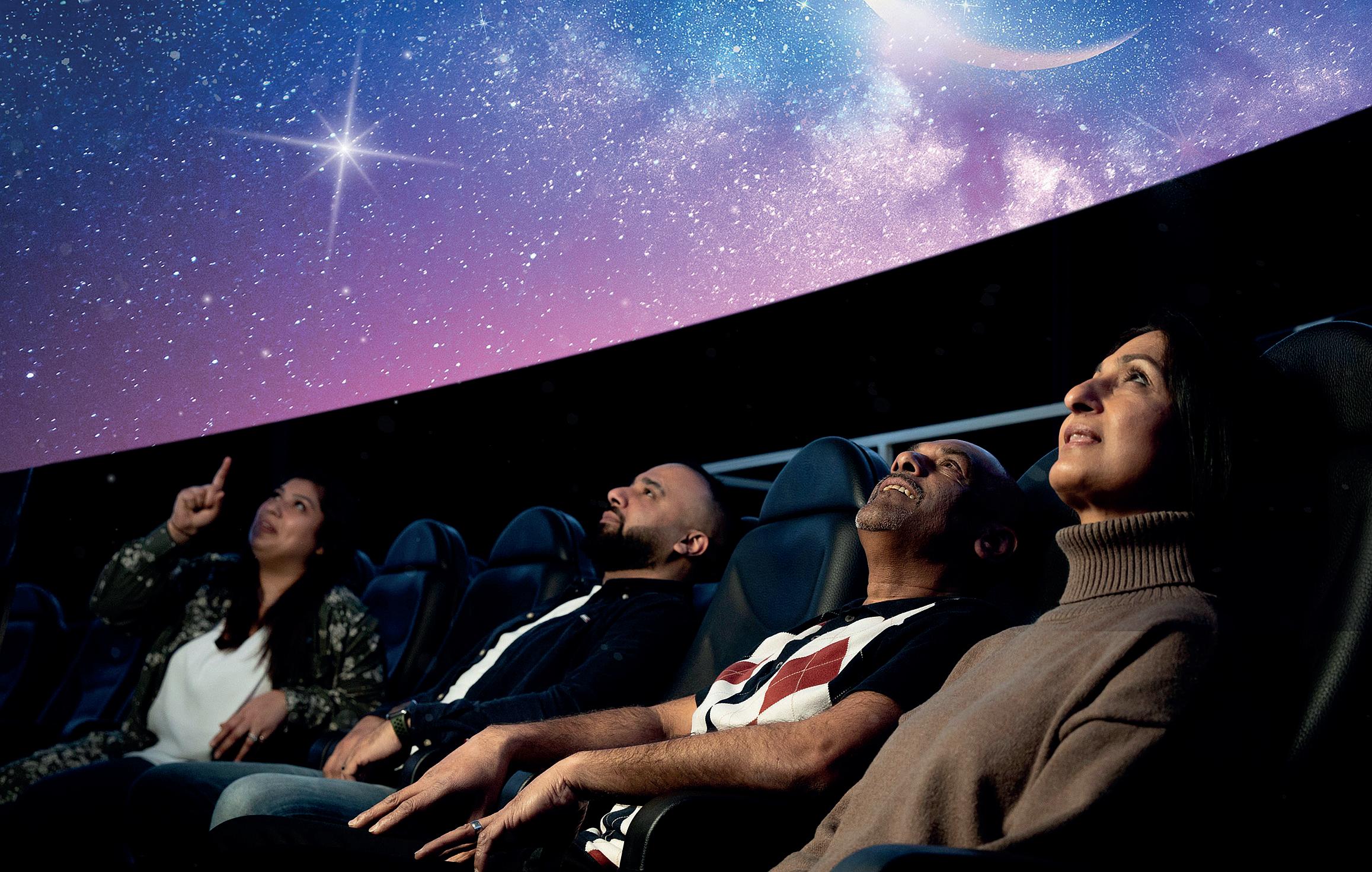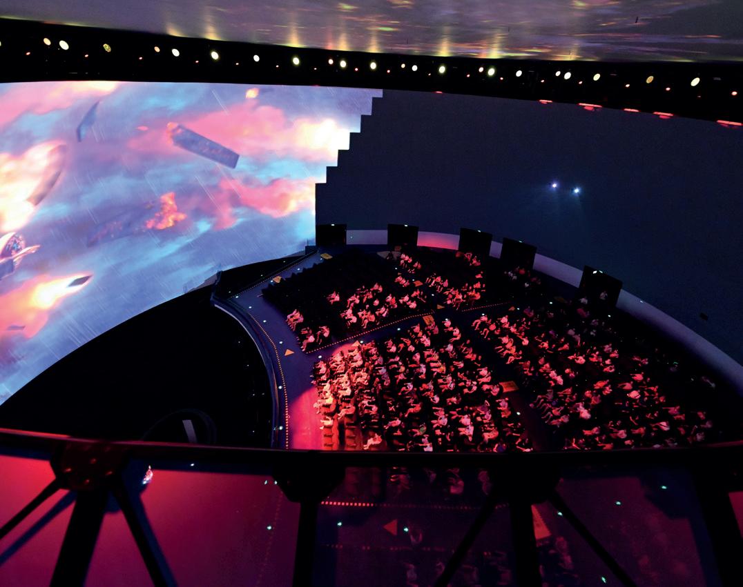 guests suspended in gondola-style seating, simulating flight through motion programming, sensory effects like wind, mist and scent and a 17-metre-wide dome screen.
