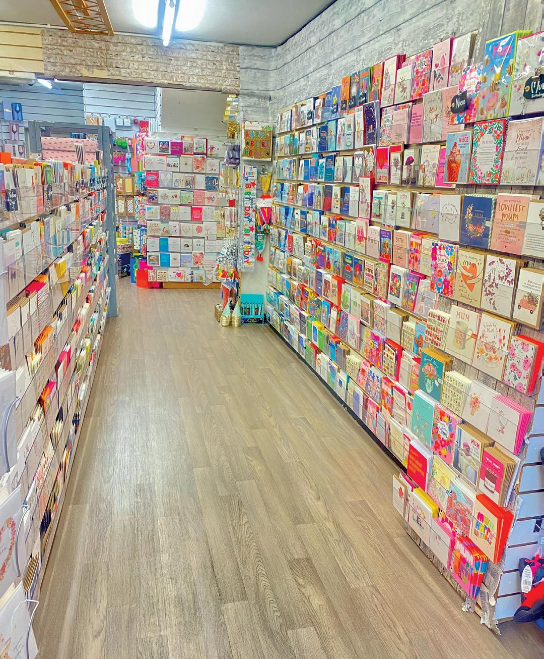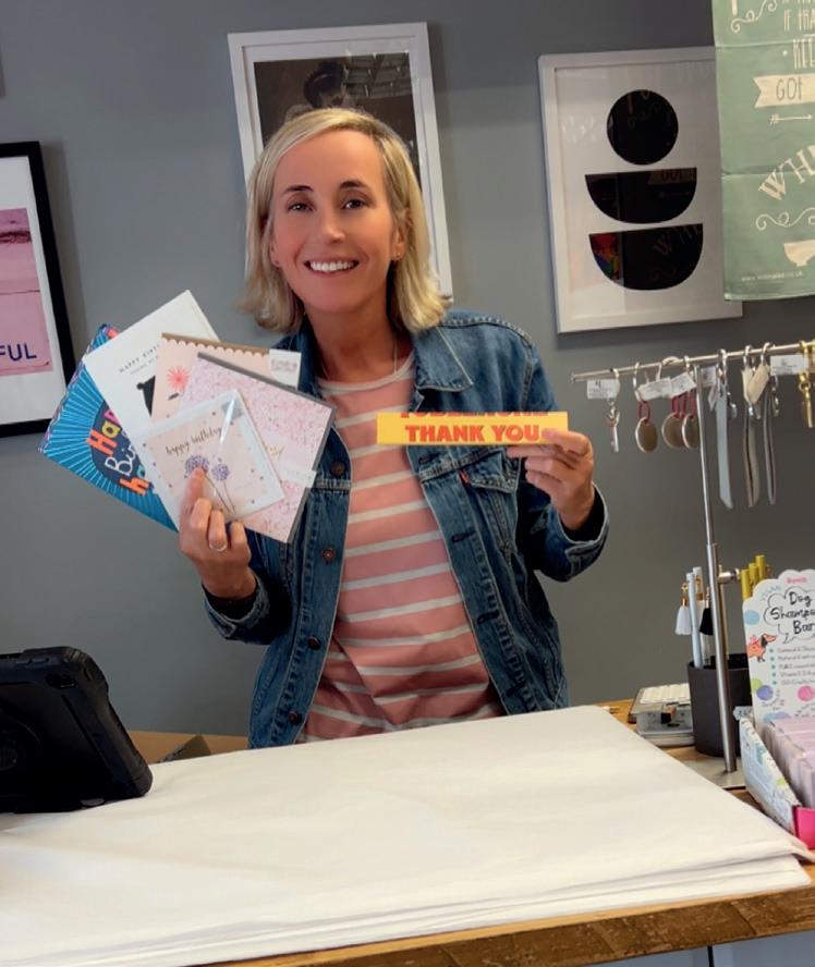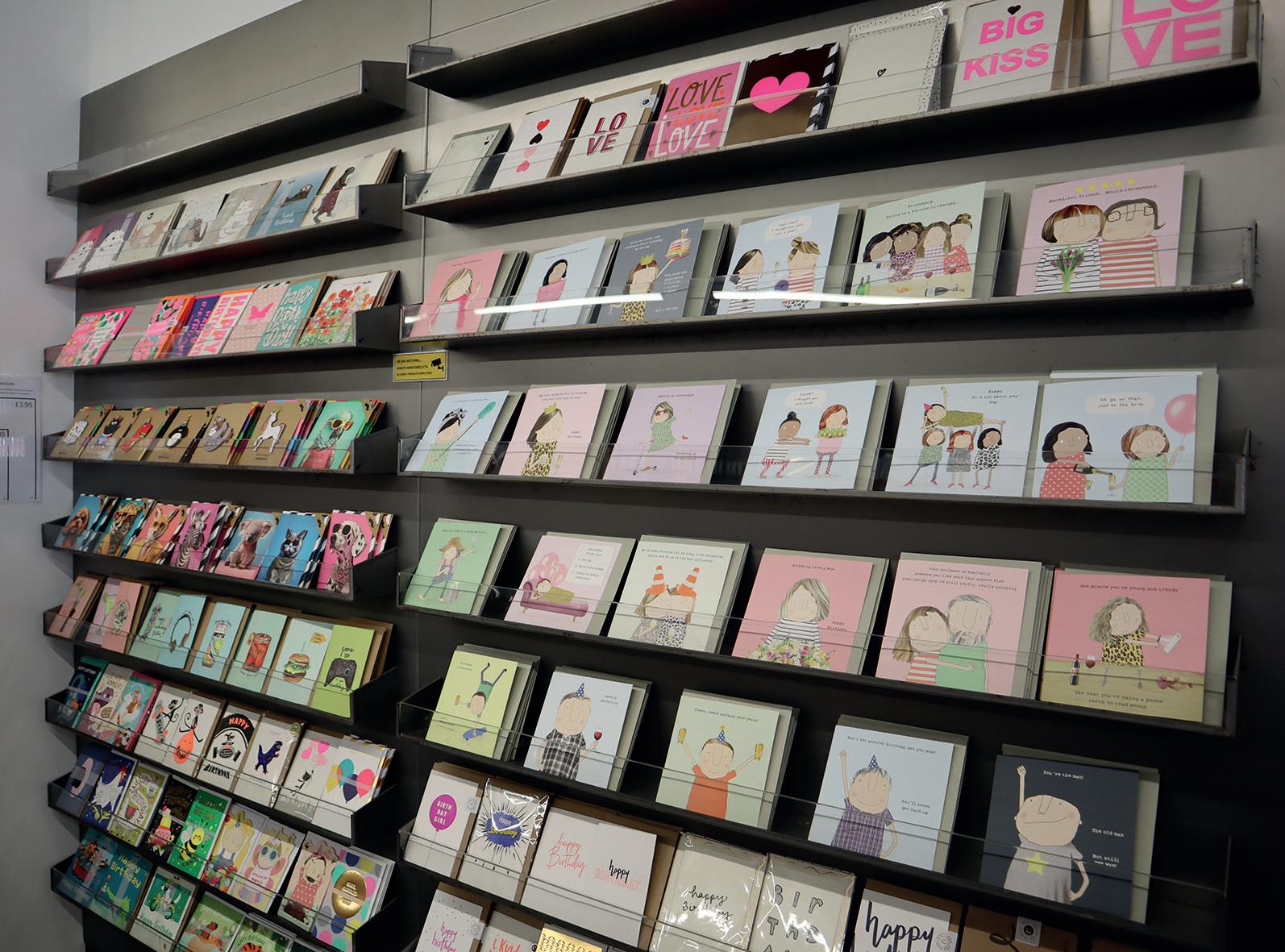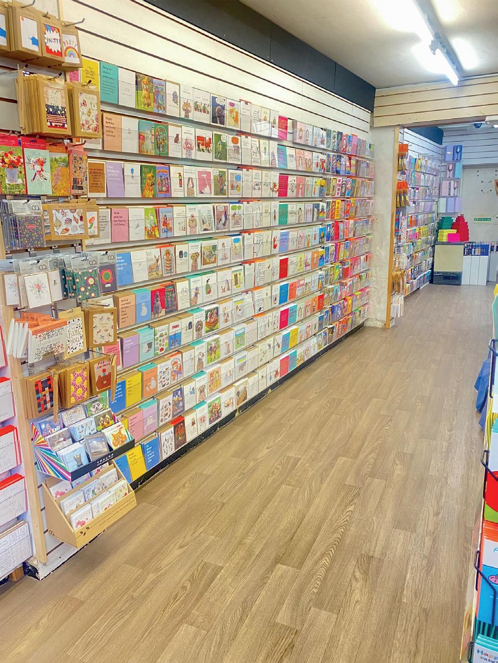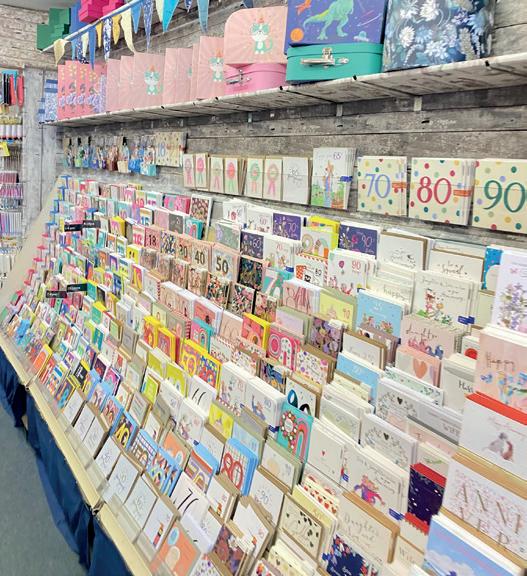 Odd Jobs Paul, and his skills and incredibly positive attitude have been a constant support. One of the initial changes we made, particularly in the card area, was the introduction of Perspex card display shelves that fit into the slat wall, bespoke made by a local company All Style Birchington. These allow us to display each card full-facing, so customers can really see the whole design and read the message easily. We started with these above the traditional card stands, but then we realised that by utilising the floor space di erently, we could allow more people to browse comfortably. We also came to the conclusion that having fewer cards displayed full-face was more impactful than having lots of cards stacked up in traditional stands. So, we changed the first side of the card shop, taking out around six card stands and replacing them entirely with these Perspex shelves.