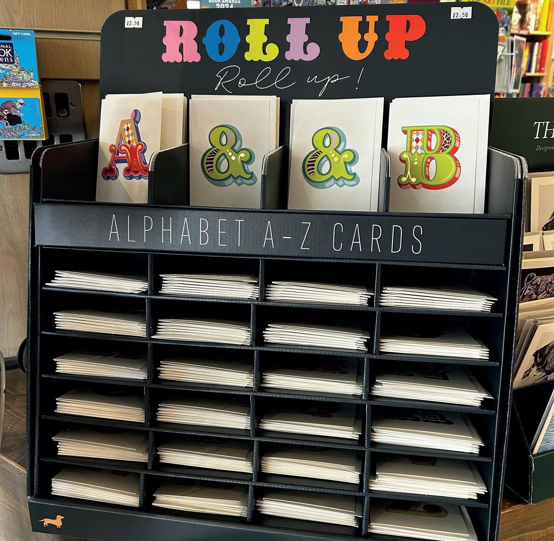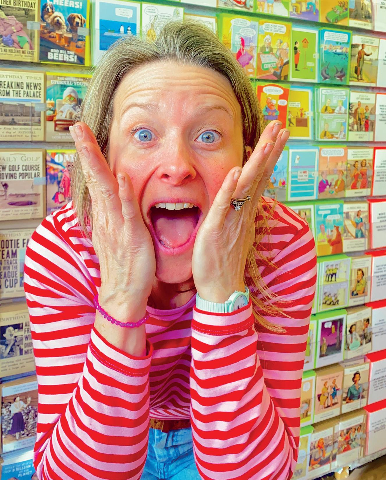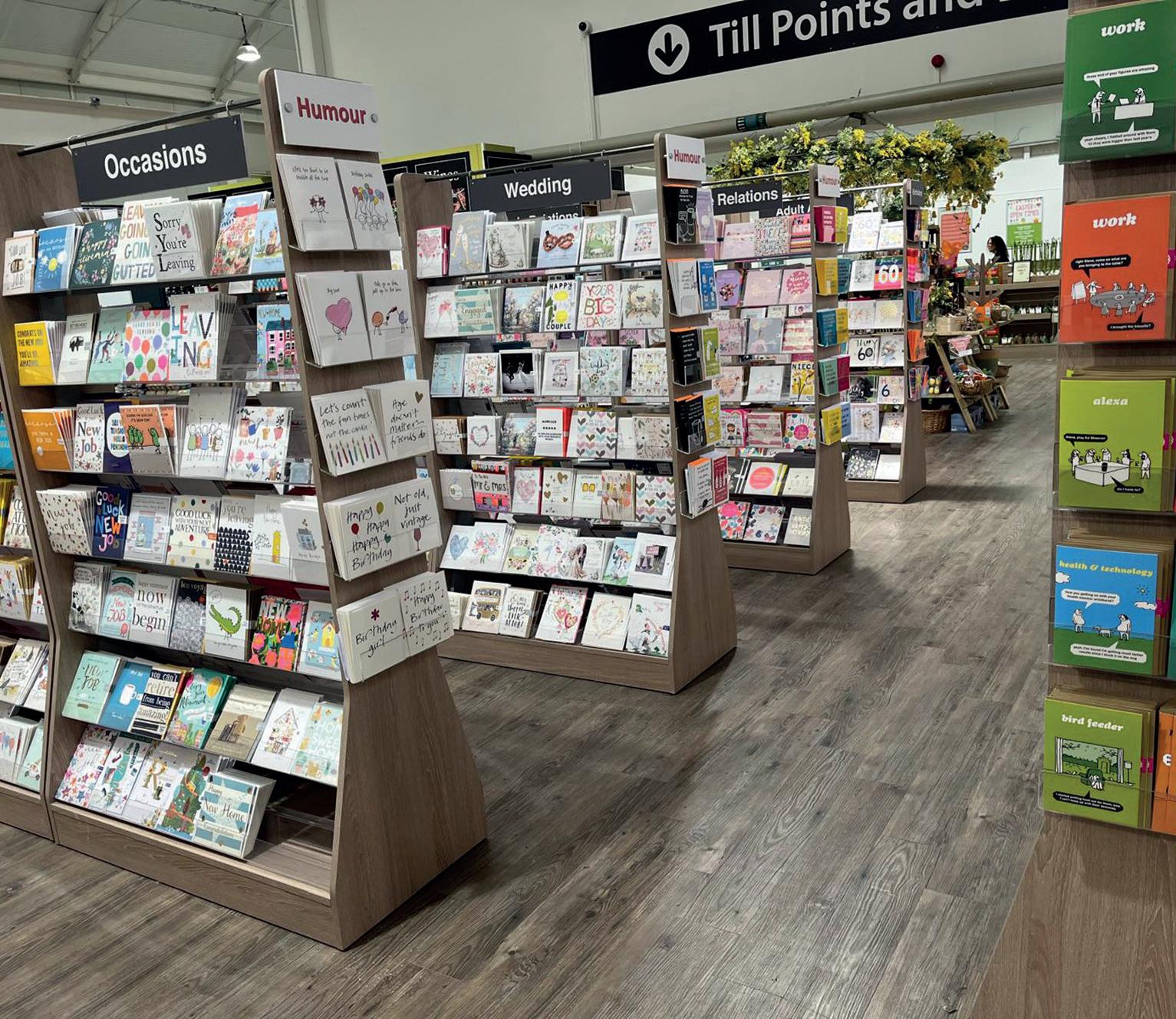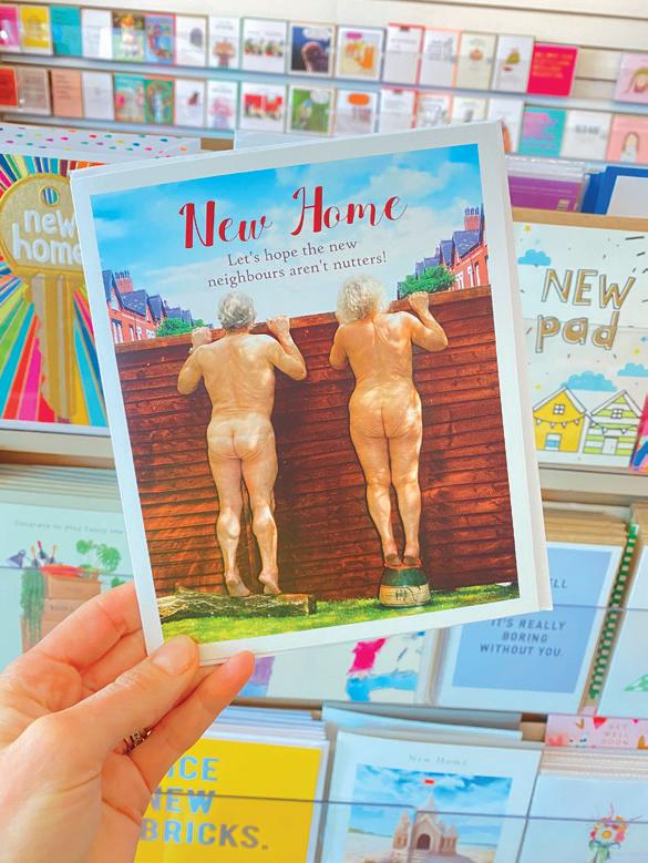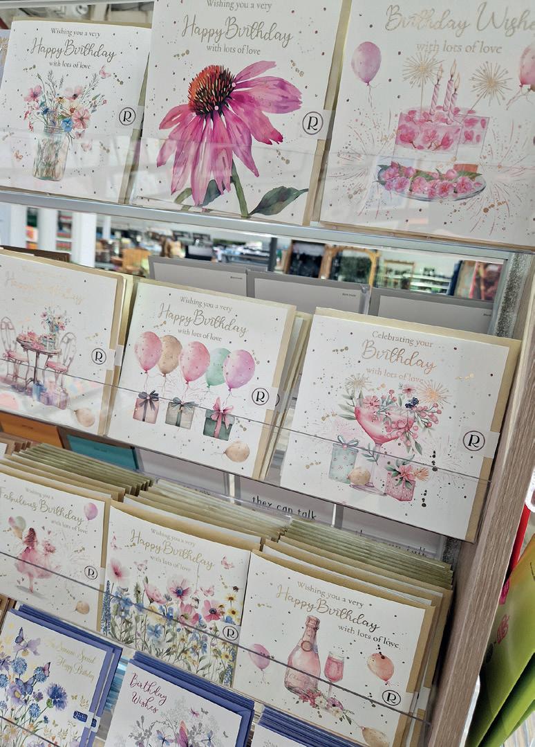 Odd Jobs Paul, and his skills and incredibly positive attitude have been a constant support. One of the initial changes we made, particularly in the card area, was the introduction of Perspex card display shelves that fit into the slat wall, bespoke made by a local company All Style Birchington. These allow us to display each card full-facing, so customers can really see the whole design and read the message easily. We started with these above the traditional card stands, but then we realised that by utilising the floor space di erently, we could allow more people to browse comfortably. We also came to the conclusion that having fewer cards displayed full-face was more impactful than having lots of cards stacked up in traditional stands. So, we changed the first side of the card shop, taking out around six card stands and replacing them entirely with these Perspex shelves.