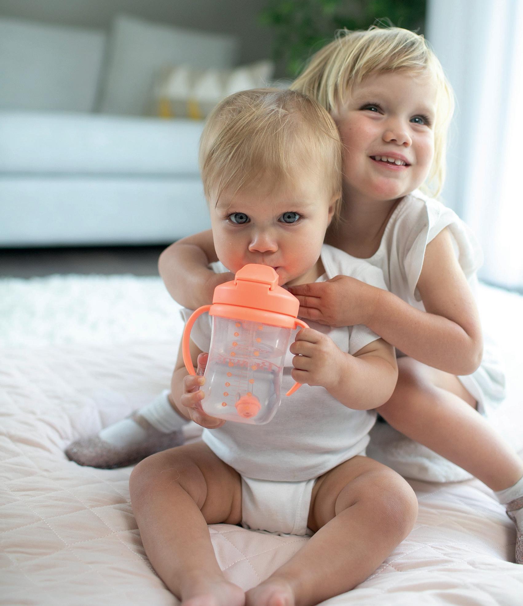 Designed with a soft, silicone weighted straw, it allows baby to drink from any angleeliminating frustration and encouraging independence. Easy-grip handles help little hands hold on tight and can be removed as baby grows.