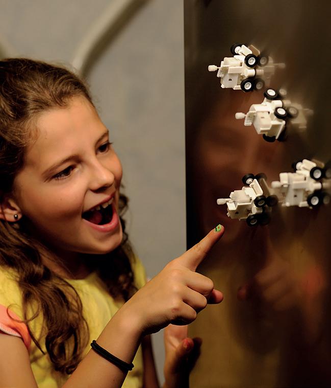 The Fridge Rover combines a magnet and a wind-up vehicle. Inside the clockwork mechanism, there is a coiled spring that winds up tightly when the crank is turned. This stores energy in the spring and, when it’s let go, the spring uncoils, releasing the stored energy and turning the wheels. The wheels can grip the surface of the fridge without failing because the magnet holds the Fridge Rover firmly against the fridge.