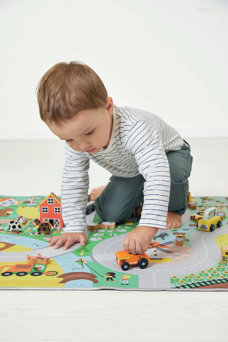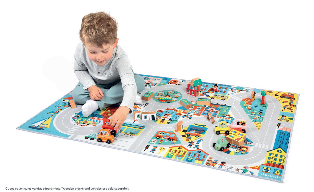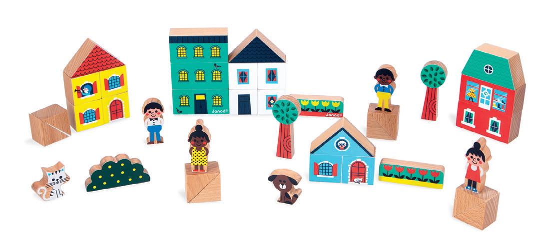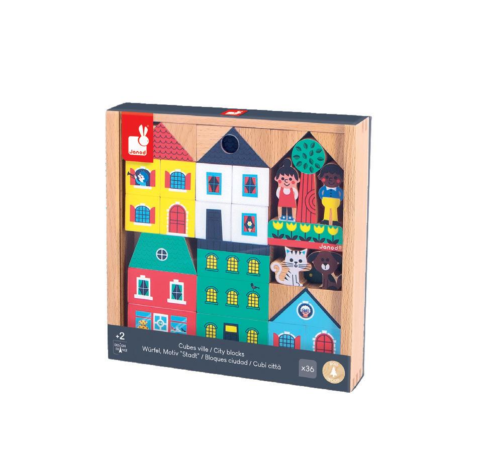 The perfect accompaniment to the Janod Cross Roads Playmat is the set of 36 solid wood blocks for children aged two-plus to build their own little town. With a total of 36 solid wood elements, this building set contains: 25 cubes to assemble houses and buildings, five decorative elements to give the surroundings even more depth, and six characters and animals.