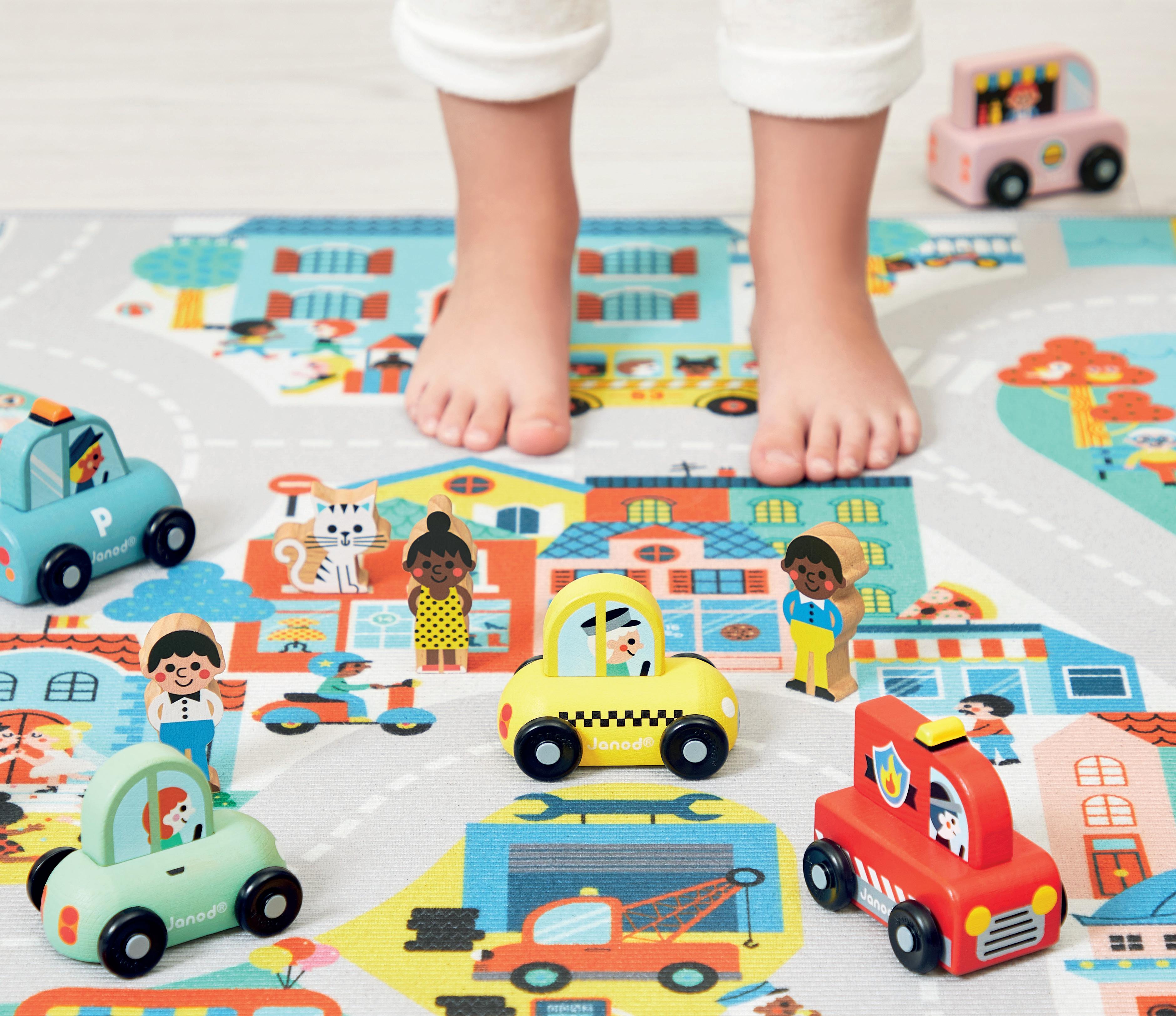 This set of city cubes and figures is part of the Cross Roads collection, a series of playmats with circuits, made even more fun when complemented by our assortments of cubes and small wooden vehicles. This set is particularly suited to the City playmat, but can also be combined with other mats in the Cross Roads range. It’s made from FSCcertified wood from sustainably managed forests. Also in the range is a collection of wooden vehicles, including Wooden Taxi, Wooden Family Car, Wooden Police Car, Wooden Food Truck, and many more. Each vehicle has been specially designed for little hands, who can easily hold it by the top to make it roll. The vehicles are perfect for inventing stories and developing imagination!